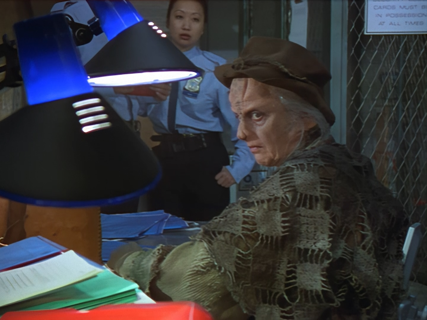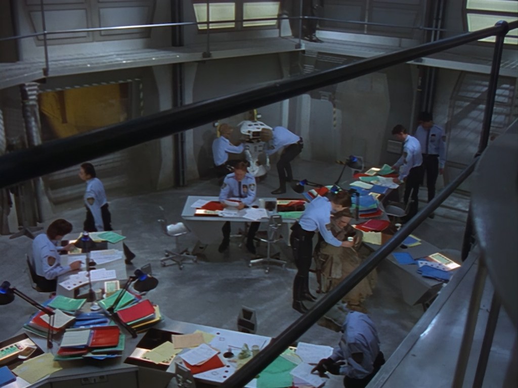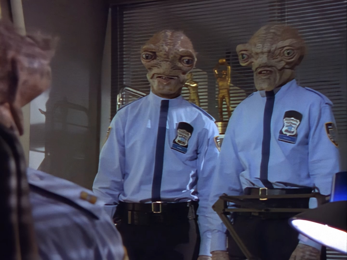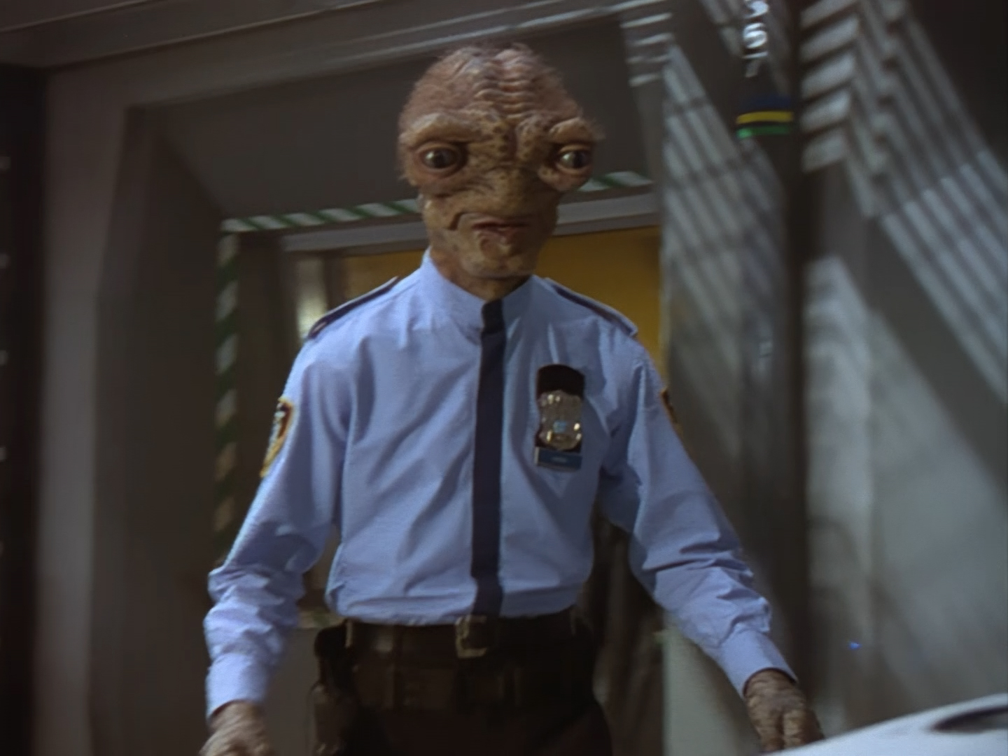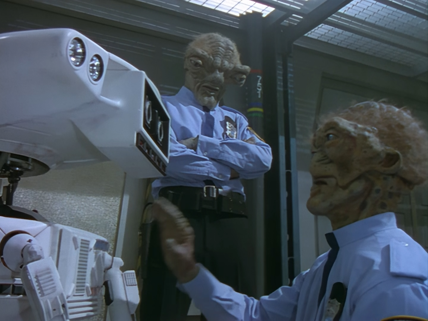 The interior set of the station house is a magnificent two-tier structure – a feat which I have to praise set designer Tony Curtis for despite my snippiness about his work on Nissim’s apartment earlier. You can tell that directors loved finding interesting ways of establishing this room and finding all sorts of business for the actors to be doing across the two levels. And of course, we get to enjoy the eclectic mix of Tarn, Creon, and human officers going about their police duties.