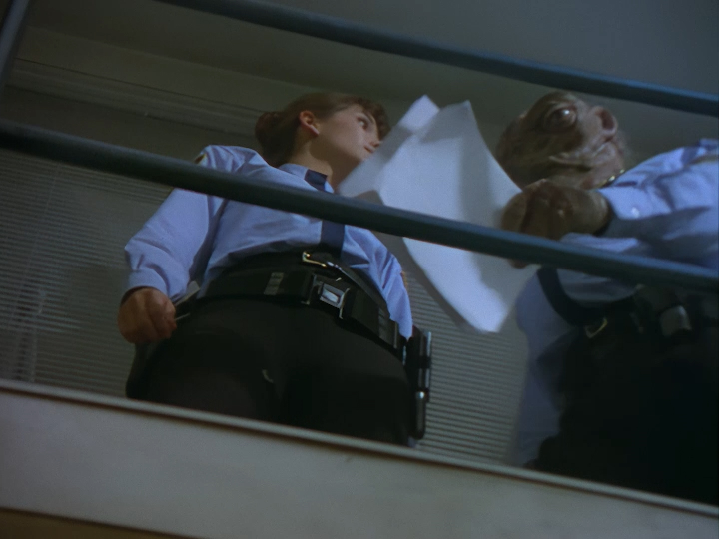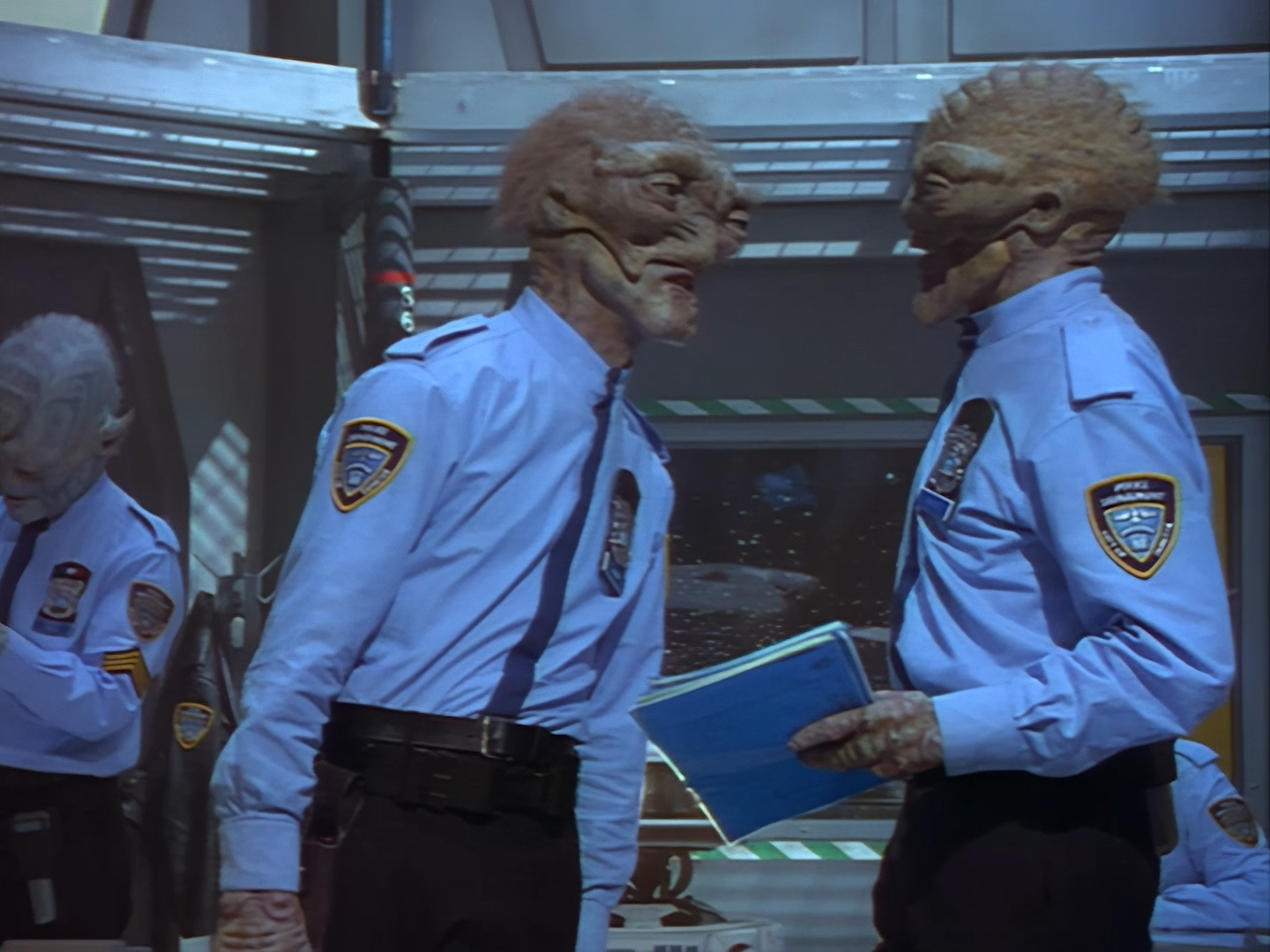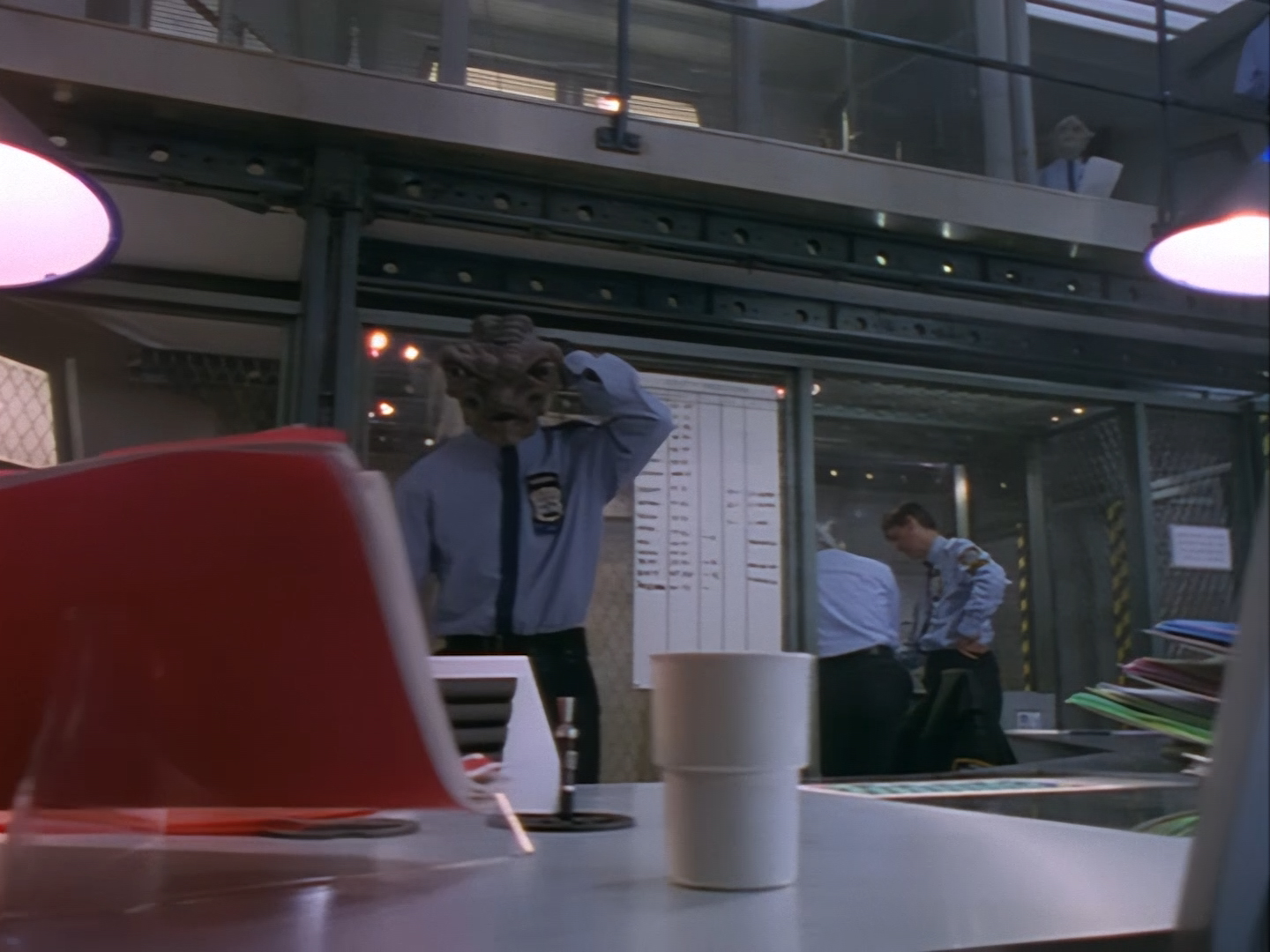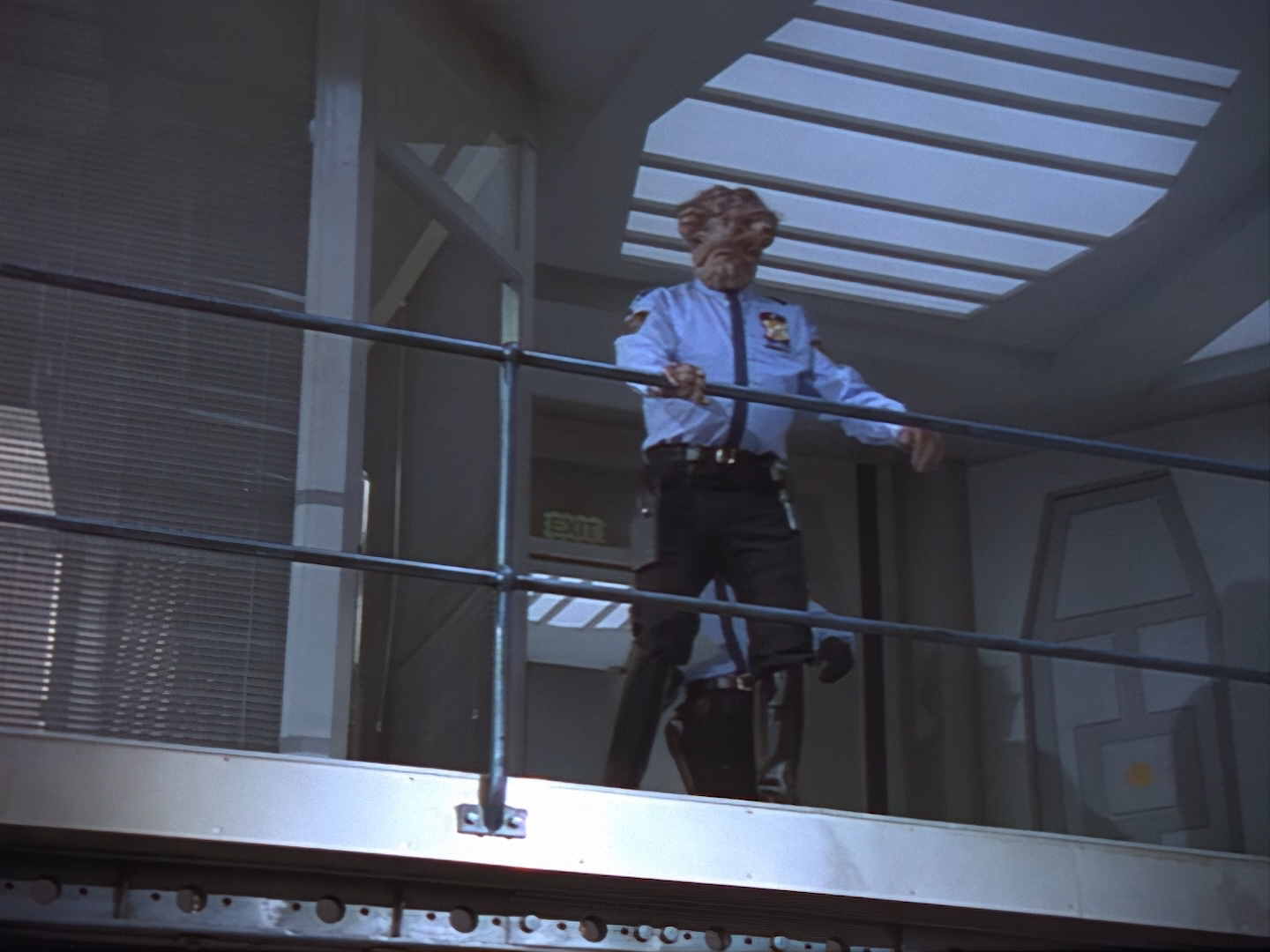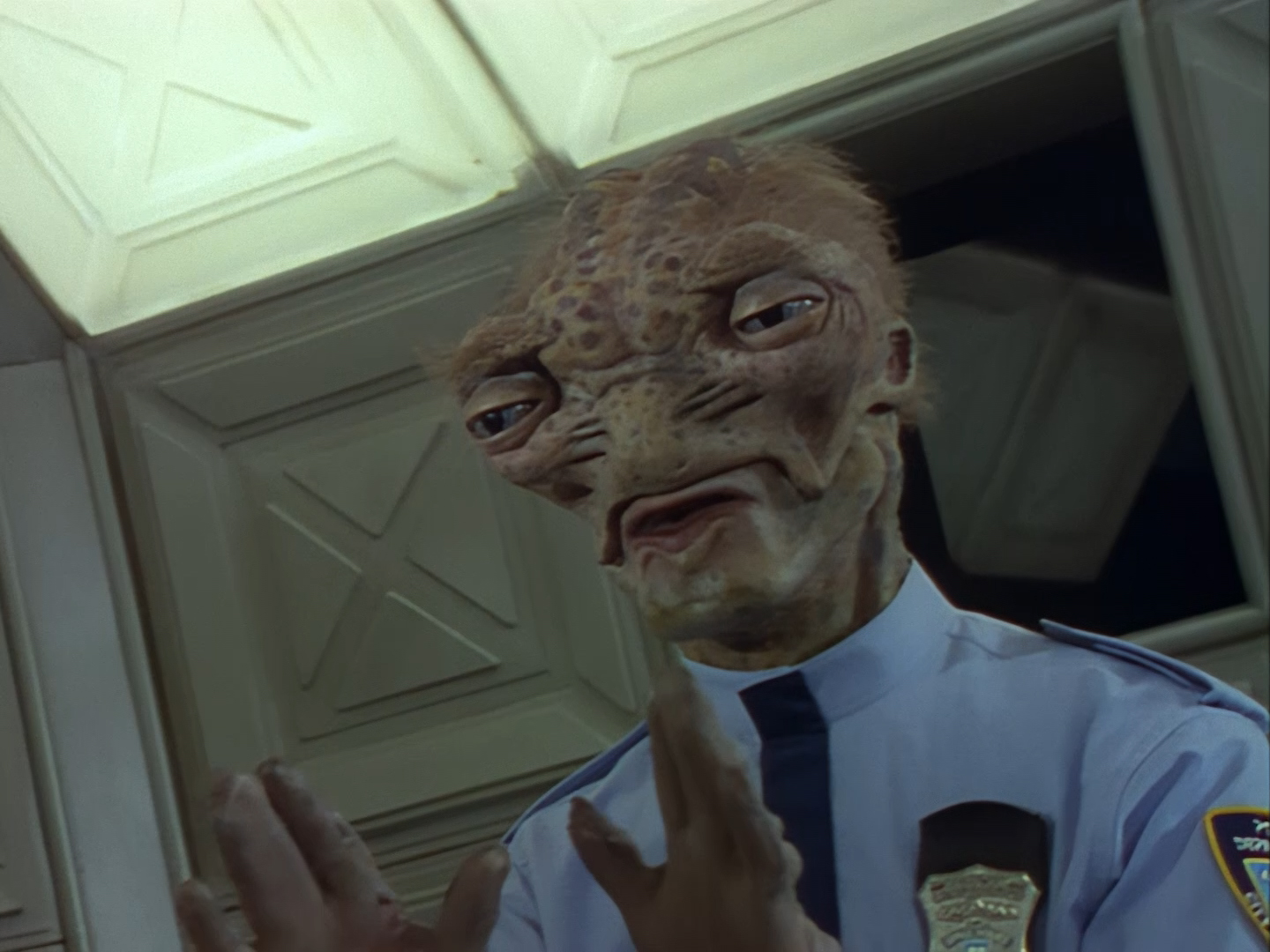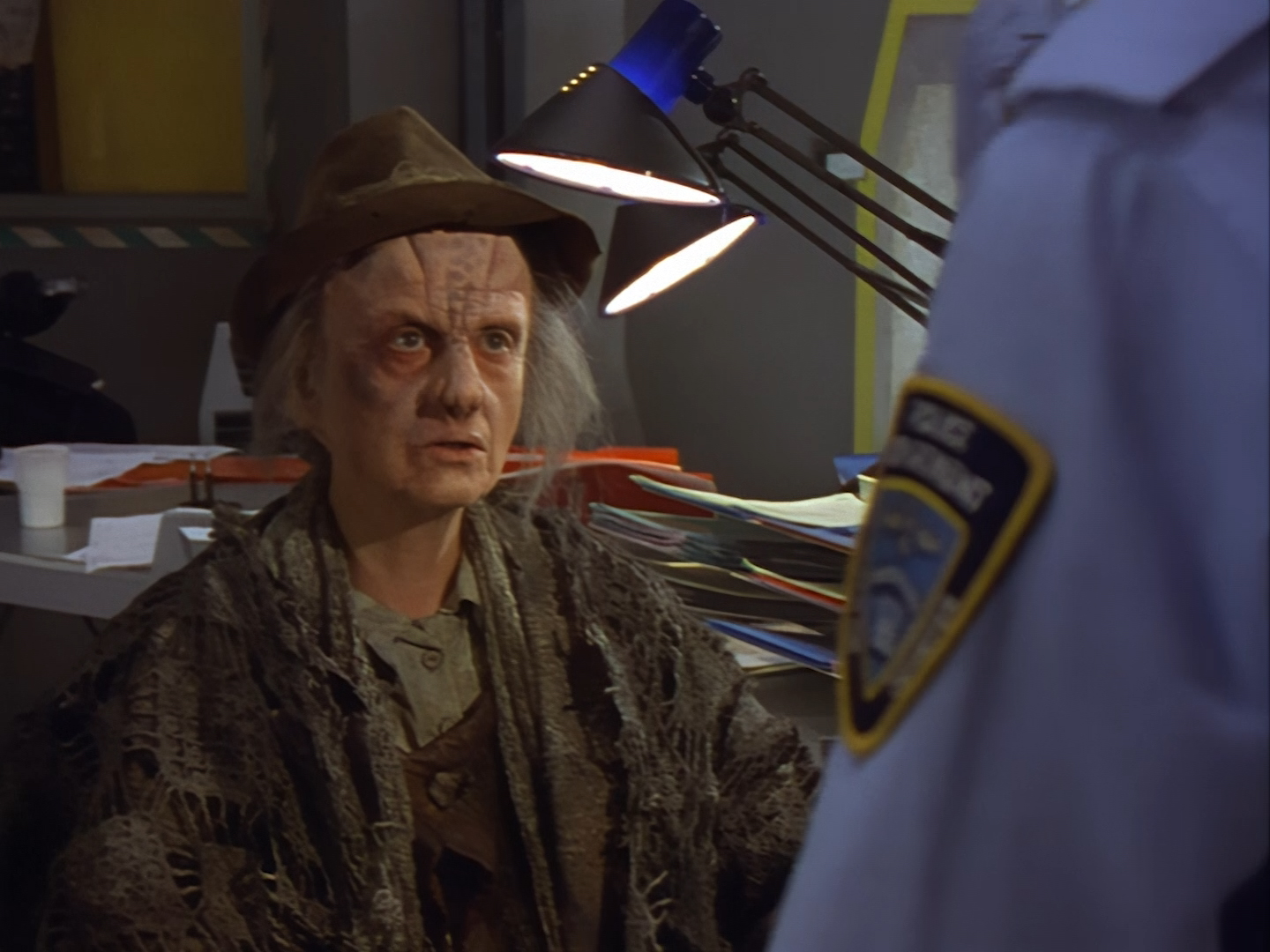 The interior set of the station house is a magnificent two-tier structure – a feat which I have to praise set designer Tony Curtis for despite my snippiness about his work on Nissim’s apartment earlier. You can tell that directors loved finding interesting ways of establishing this room and finding all sorts of business for the actors to be doing across the two levels. And of course, we get to enjoy the eclectic mix of Tarn, Creon, and human officers going about their police duties.