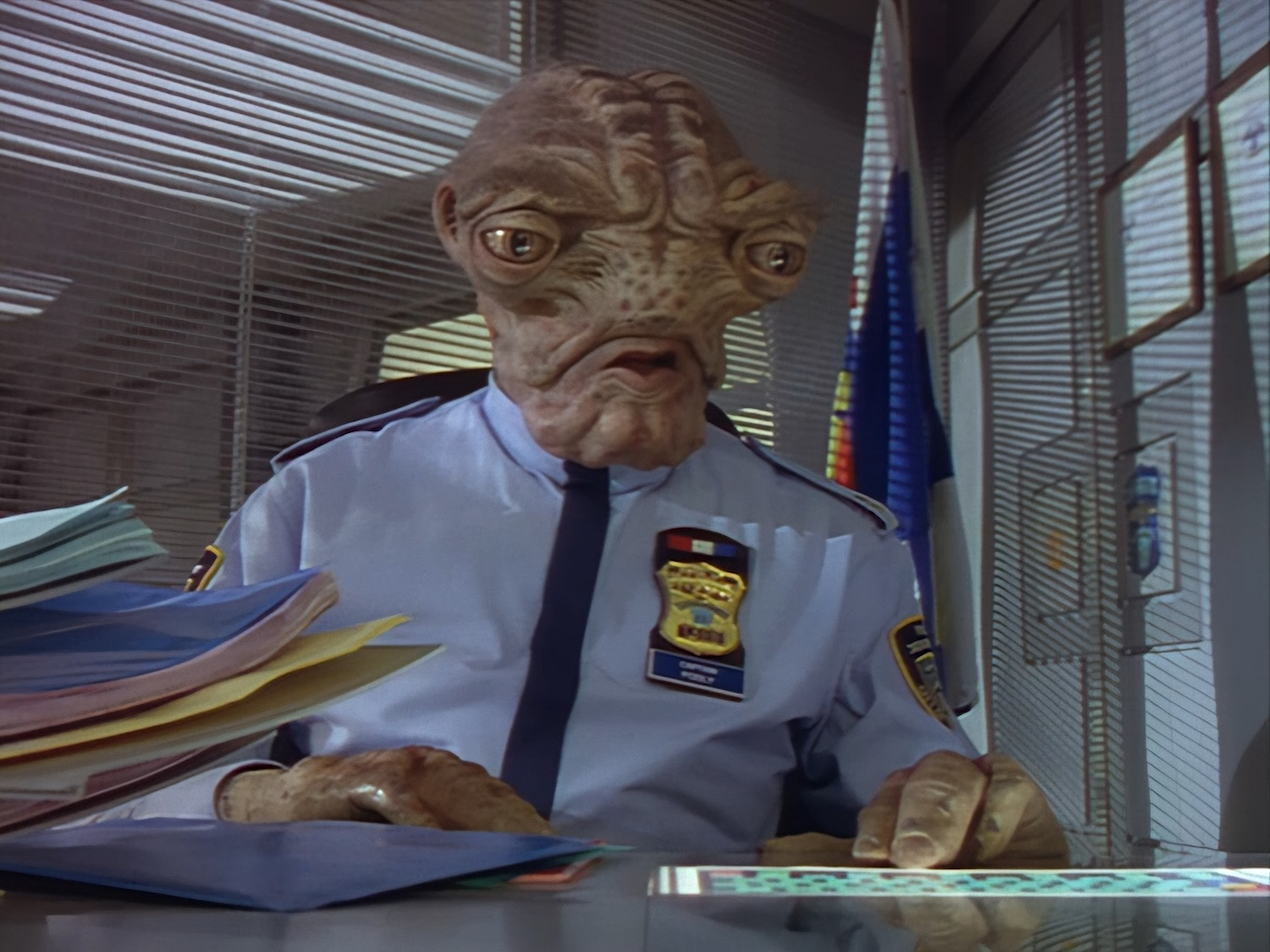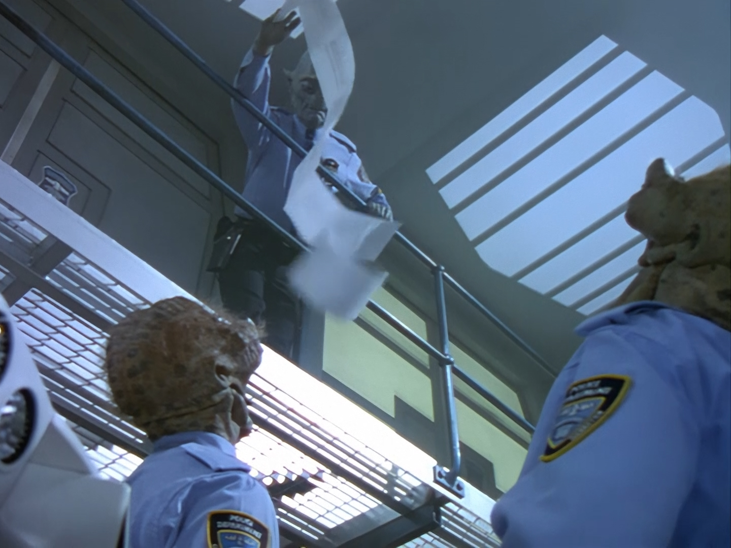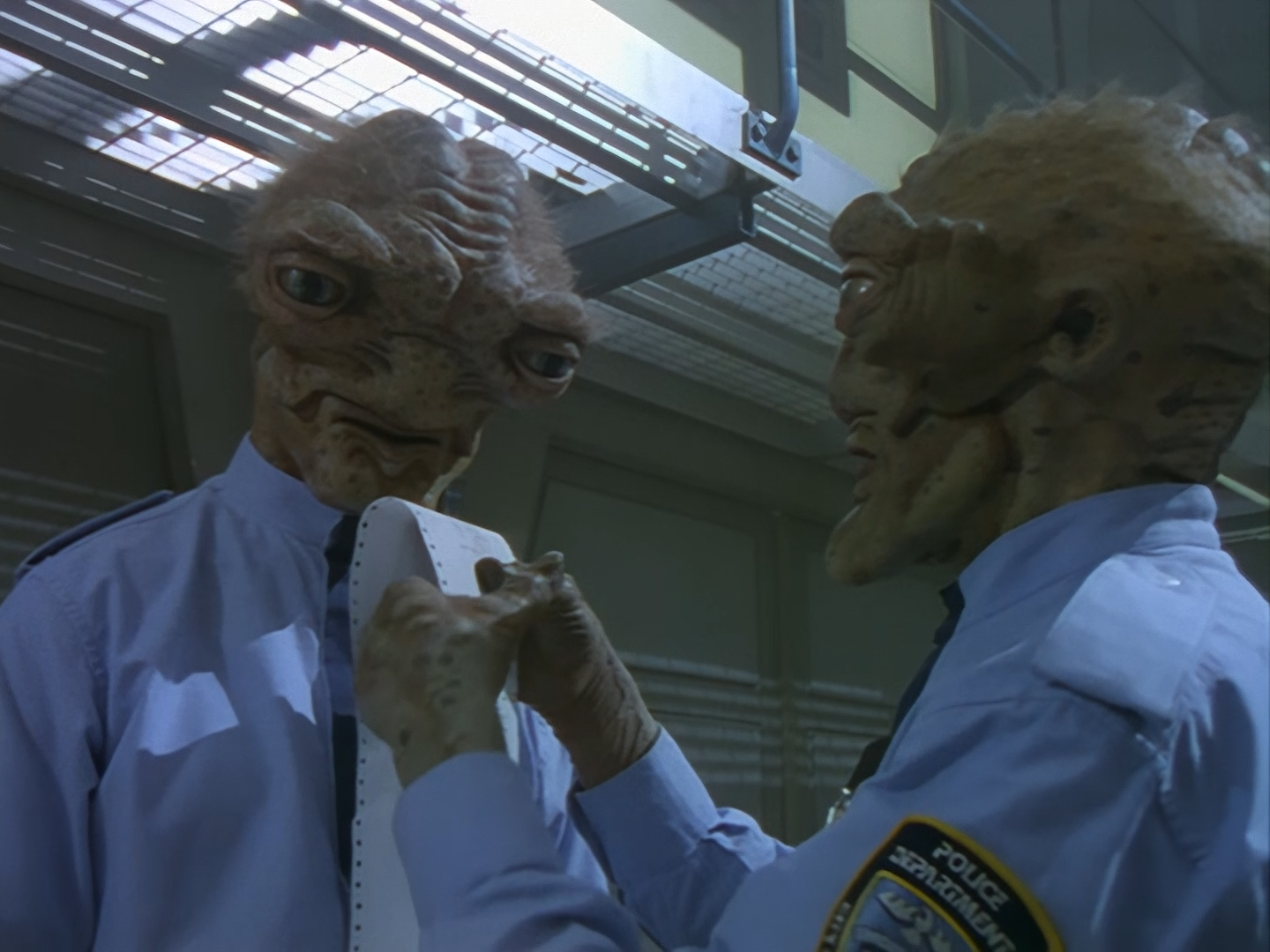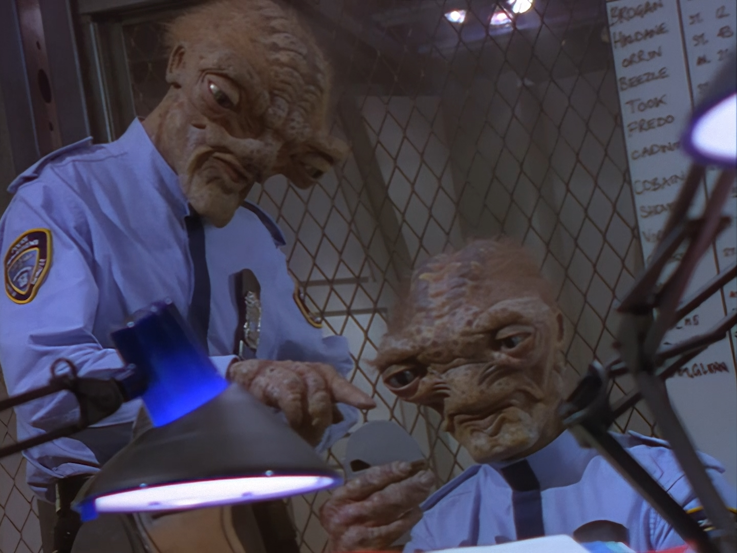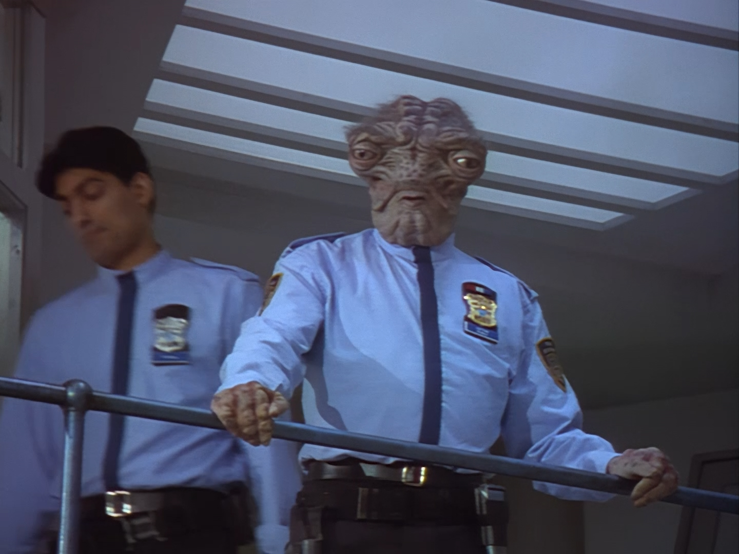 The interior set of the station house is a magnificent two-tier structure – a feat which I have to praise set designer Tony Curtis for despite my snippiness about his work on Nissim’s apartment earlier. You can tell that directors loved finding interesting ways of establishing this room and finding all sorts of business for the actors to be doing across the two levels. And of course, we get to enjoy the eclectic mix of Tarn, Creon, and human officers going about their police duties.