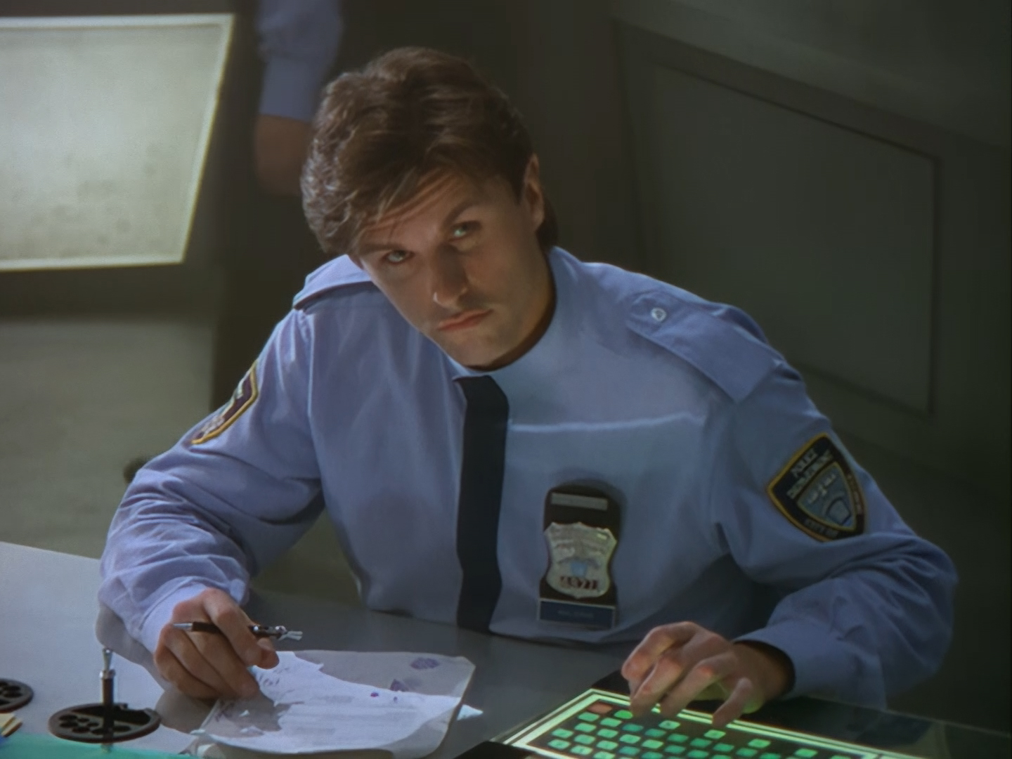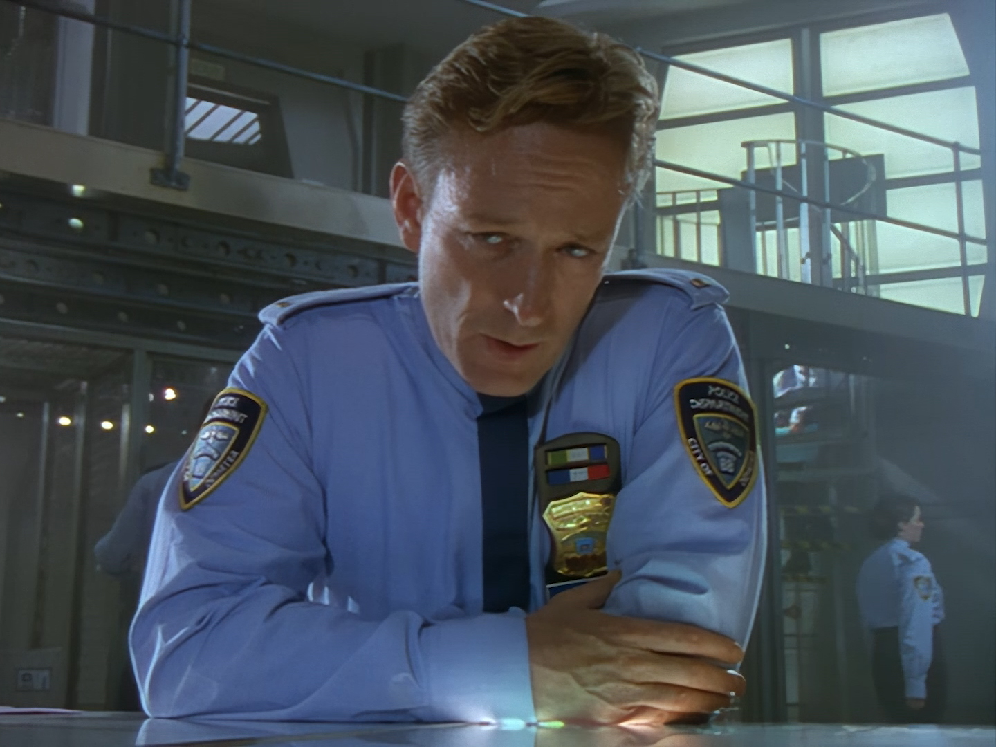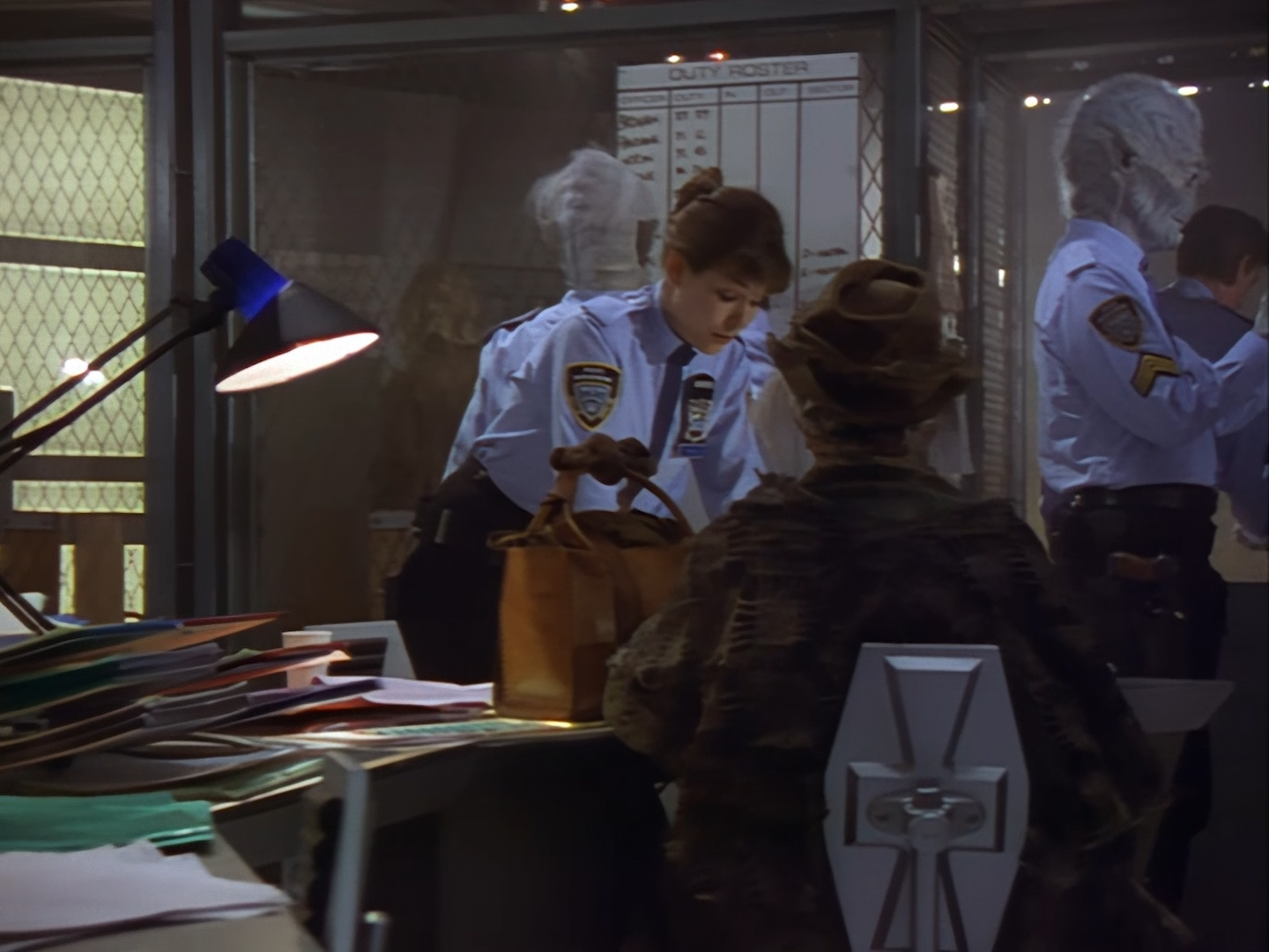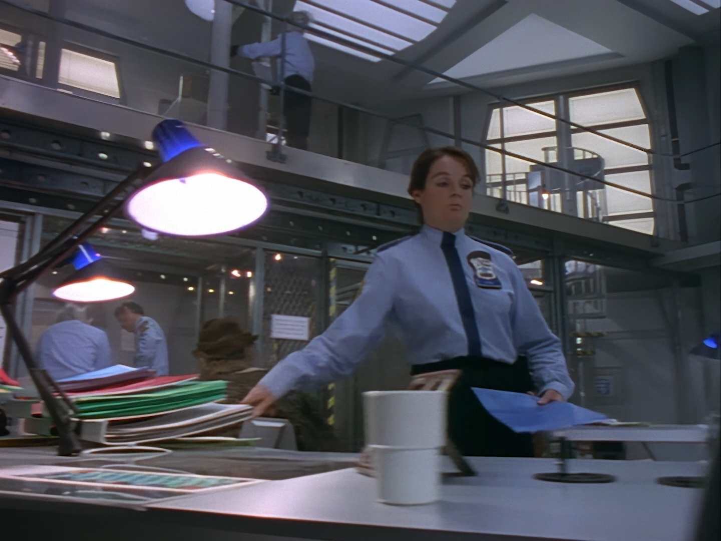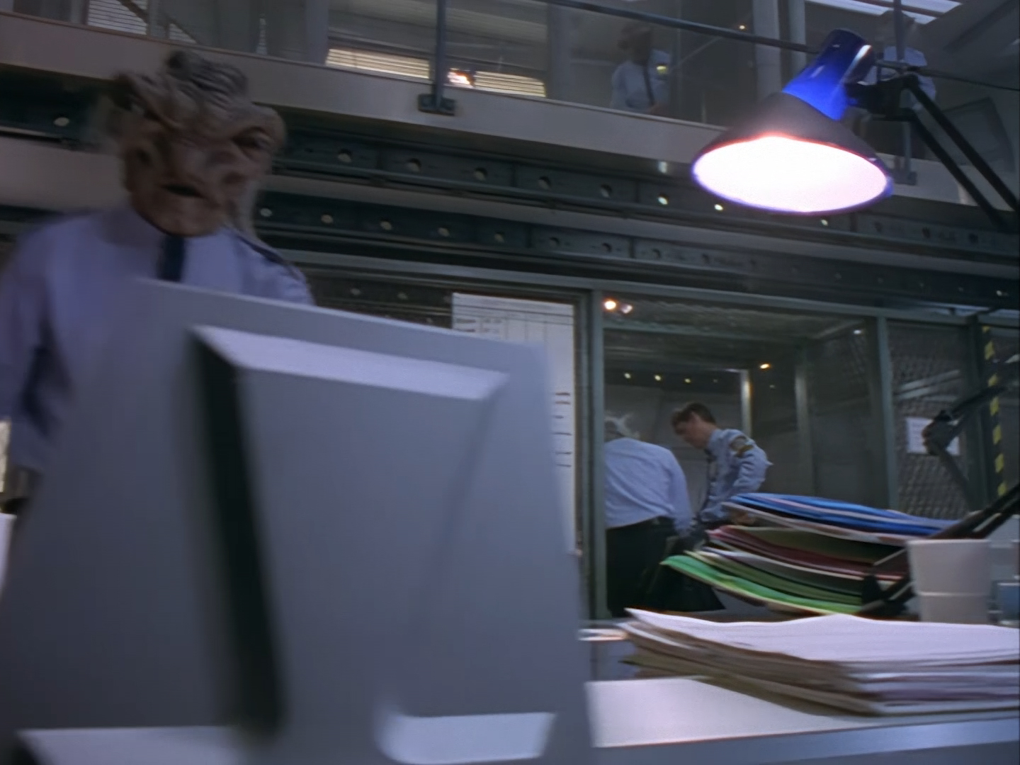 The interior set of the station house is a magnificent two-tier structure – a feat which I have to praise set designer Tony Curtis for despite my snippiness about his work on Nissim’s apartment earlier. You can tell that directors loved finding interesting ways of establishing this room and finding all sorts of business for the actors to be doing across the two levels. And of course, we get to enjoy the eclectic mix of Tarn, Creon, and human officers going about their police duties.