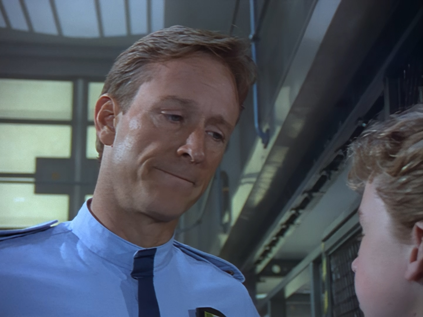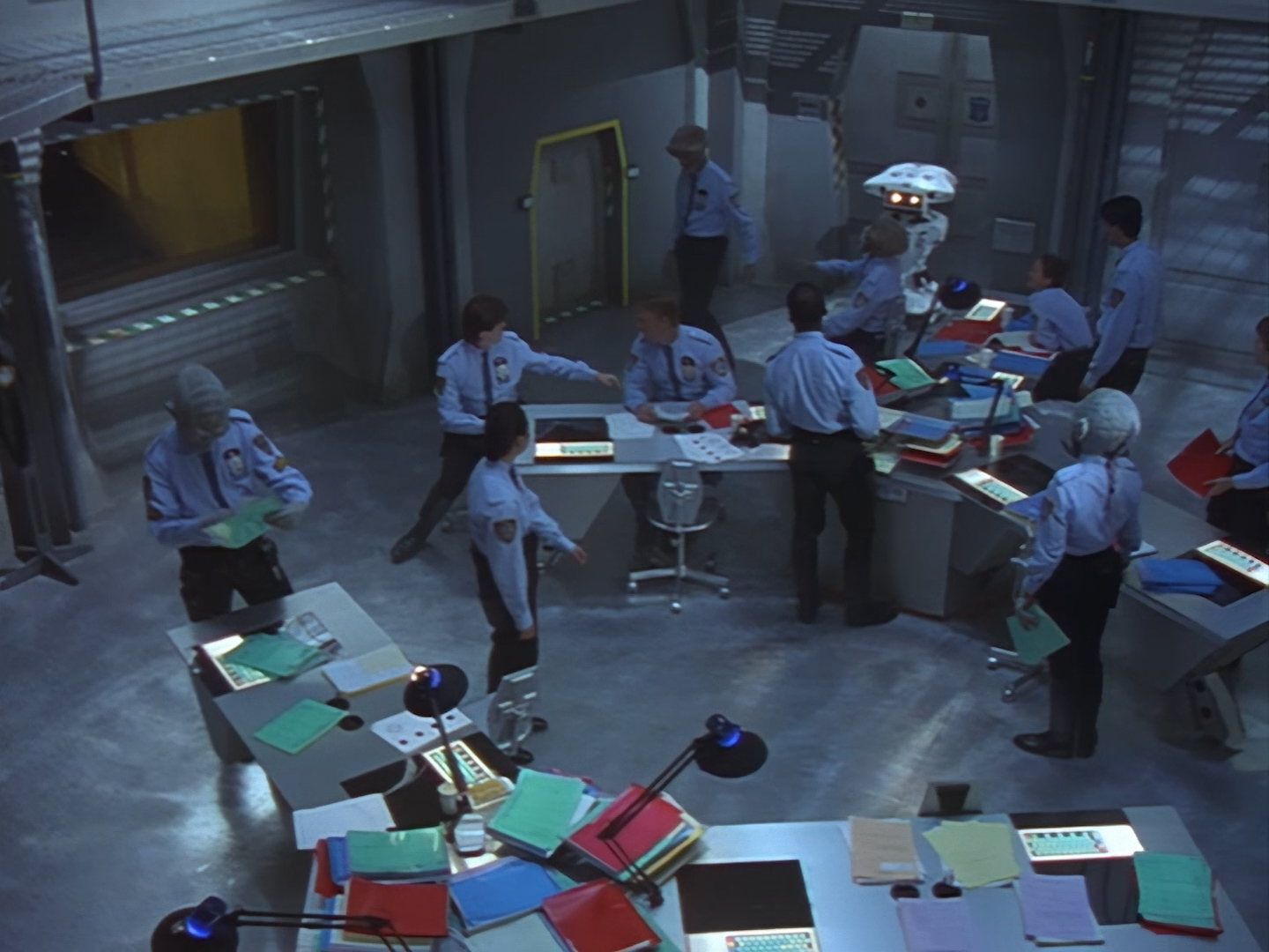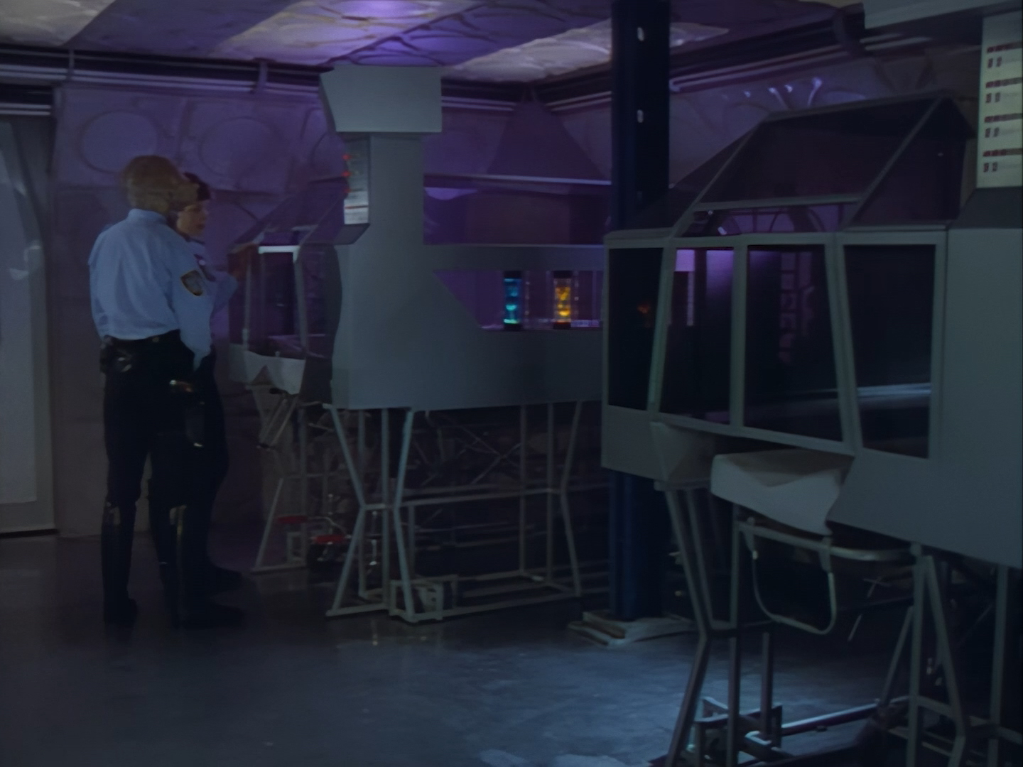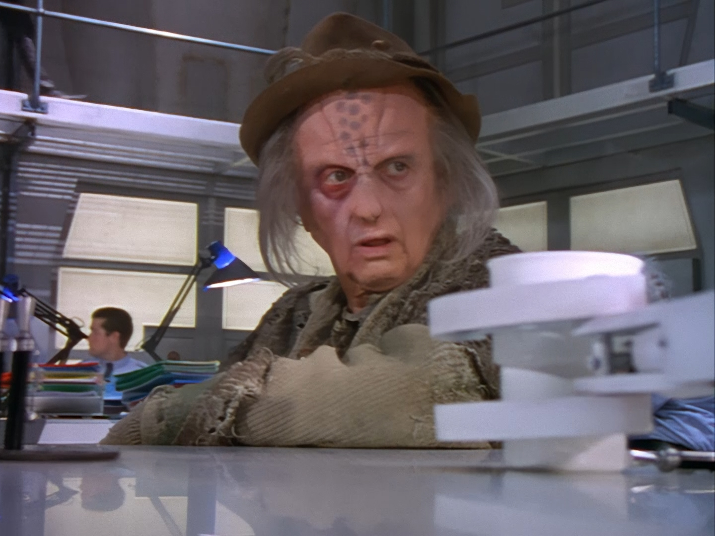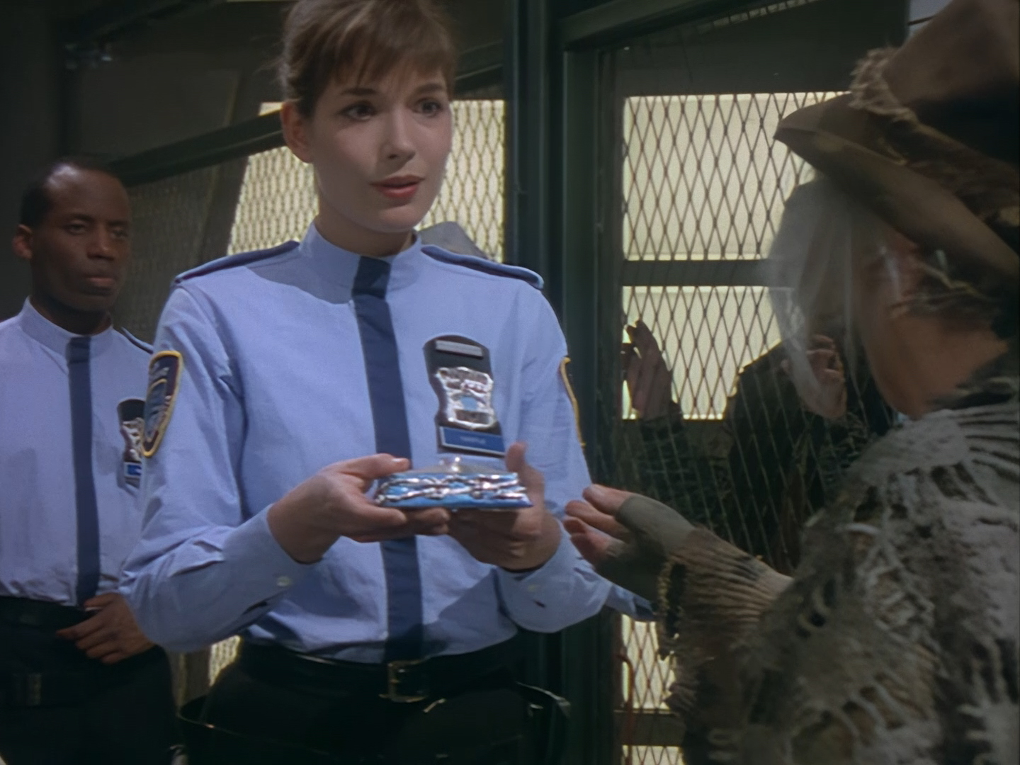 The interior set of the station house is a magnificent two-tier structure – a feat which I have to praise set designer Tony Curtis for despite my snippiness about his work on Nissim’s apartment earlier. You can tell that directors loved finding interesting ways of establishing this room and finding all sorts of business for the actors to be doing across the two levels. And of course, we get to enjoy the eclectic mix of Tarn, Creon, and human officers going about their police duties.