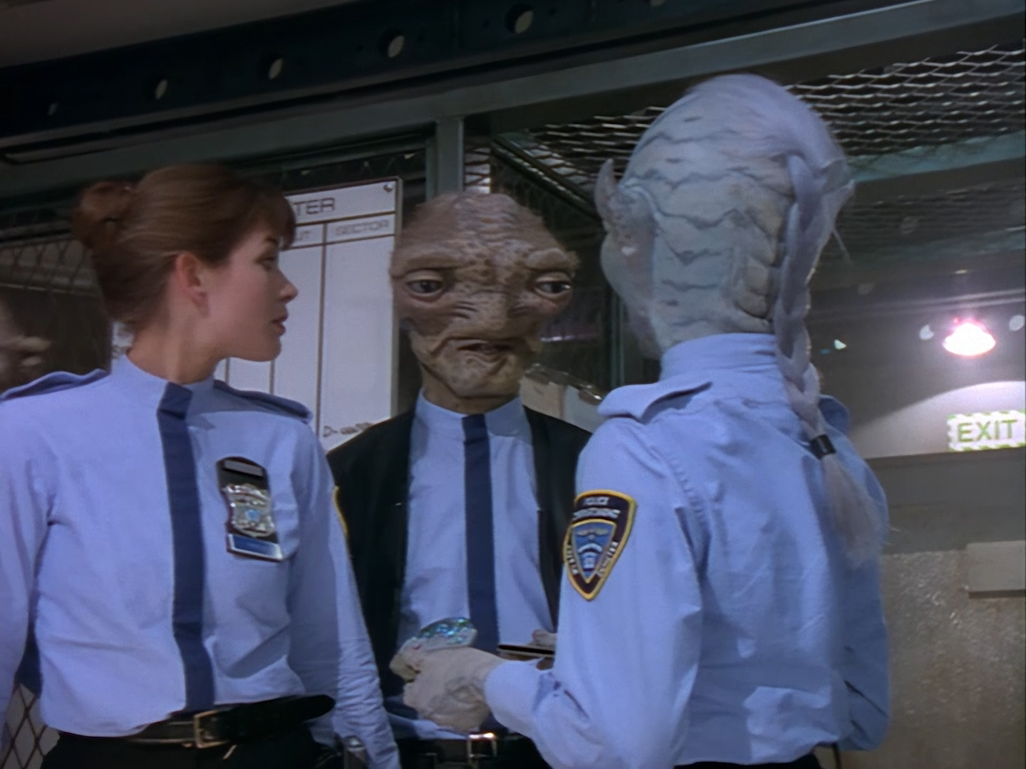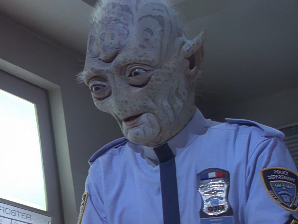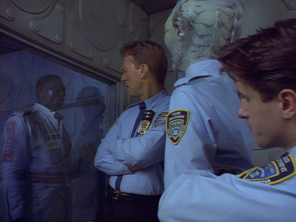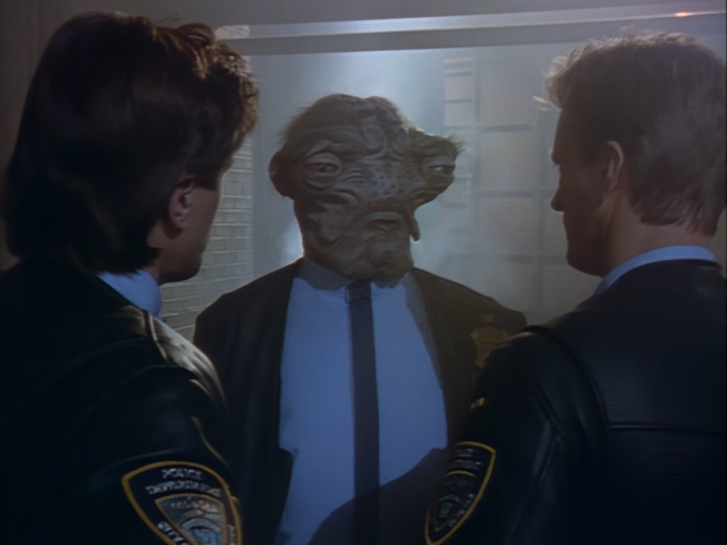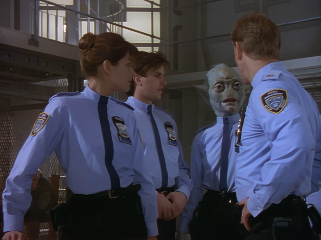 Speaking of which, Brogan pops in right on cue with the lump of Black Crystal dropped out of Nissim’s cold, dead hand. Apparently the rock has life-extending properties which make the substance very expensive and very illegal. After all, it was the 90s, and every cop show had a storyline about the war on drugs, so why not Space Precinct? Unfortunately, at least in my opinion anyway, a lot of these early episodes read like very cliché police procedural plots with the phrase “but in space” tacked on the end of them. The marriage between crime drama and science fiction can be quite hit and miss. In the case of Double Duty, it’s as if the writers took a script for NYPD Blue or Law & Order, and just substituted the word “opioid” for “Black Crystal”. Rather than looking at a real-world problem through a sci-fi lens to add depth of meaning, Double Duty and episodes like it are like looking at a real-world problem wearing a green rubber mask and not much else.
