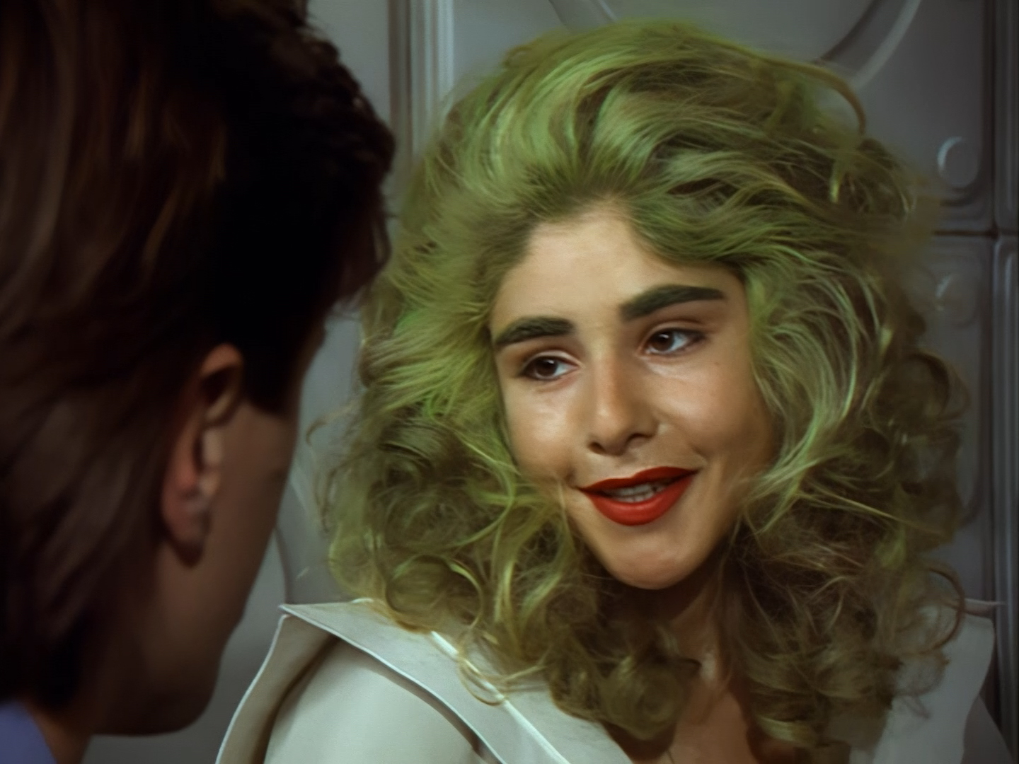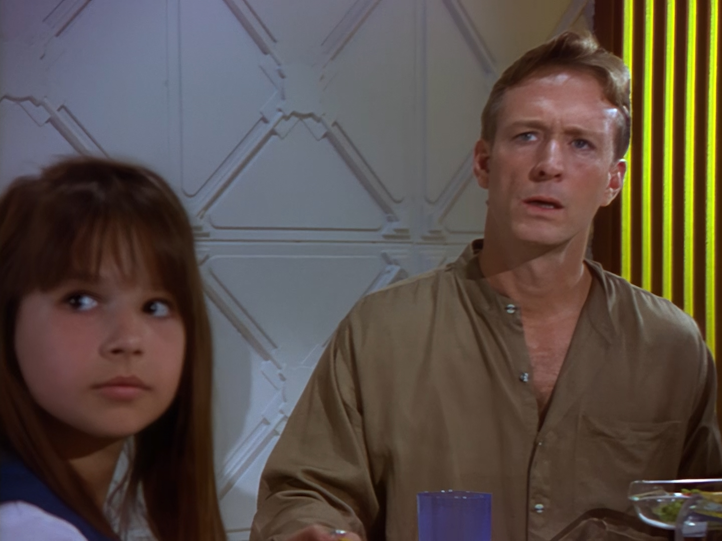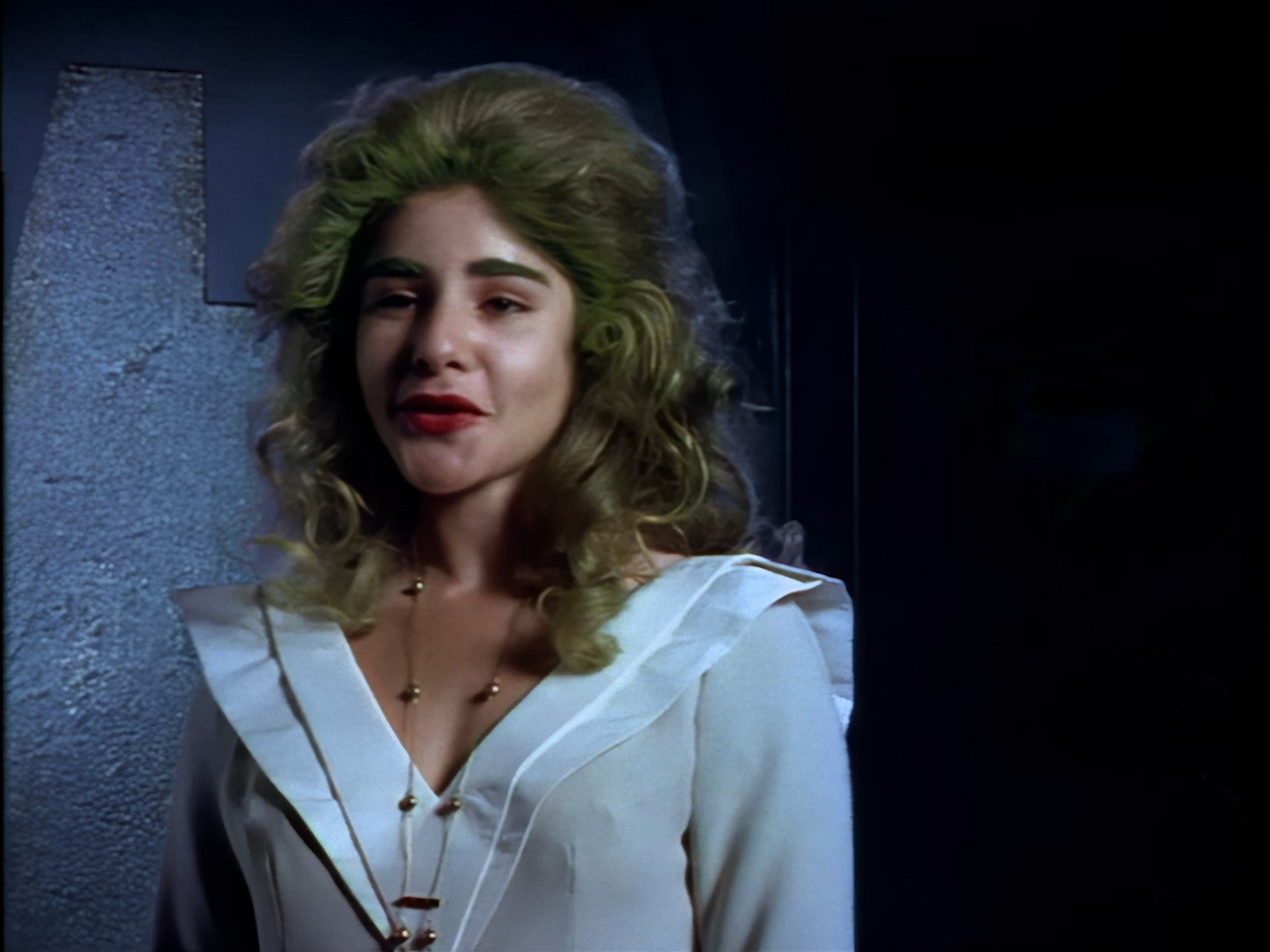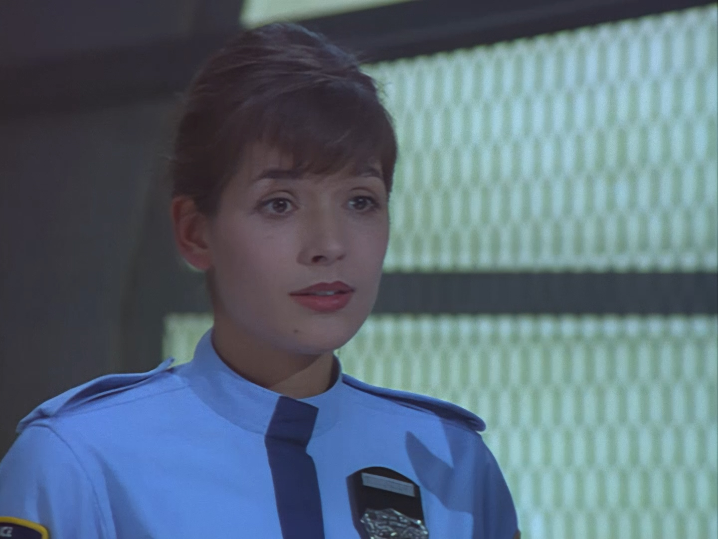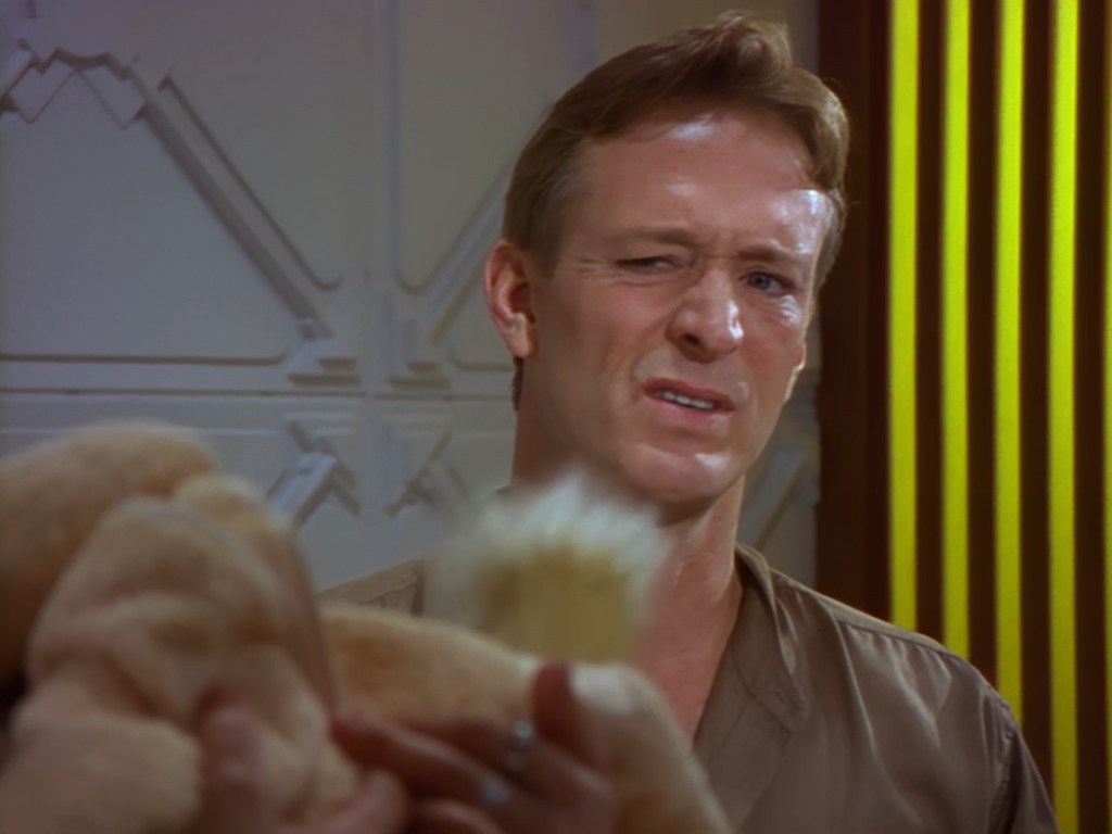 A green-haired lady appears from a doorway next to the sort of shelving unit you’d find in the back of a charity shop. Sadly, this is the point when viewers at home probably cringed so hard that the TV remote got sucked up into their hand and turned the show off. Not only is actor (and poet) Lana Citron dubbed really, really badly all the way through by Moir Leslie, but the writers actually dared to give Nissim the line, “Not to worry doll. You just concentrate on what you do best… being beautiful.” Oh but don’t worry, Nickolas Grace owns it completely by touching his girlfriend’s face like he’s stroking a fluffy duvet. I’m sure that won’t make anyone at home wretch.