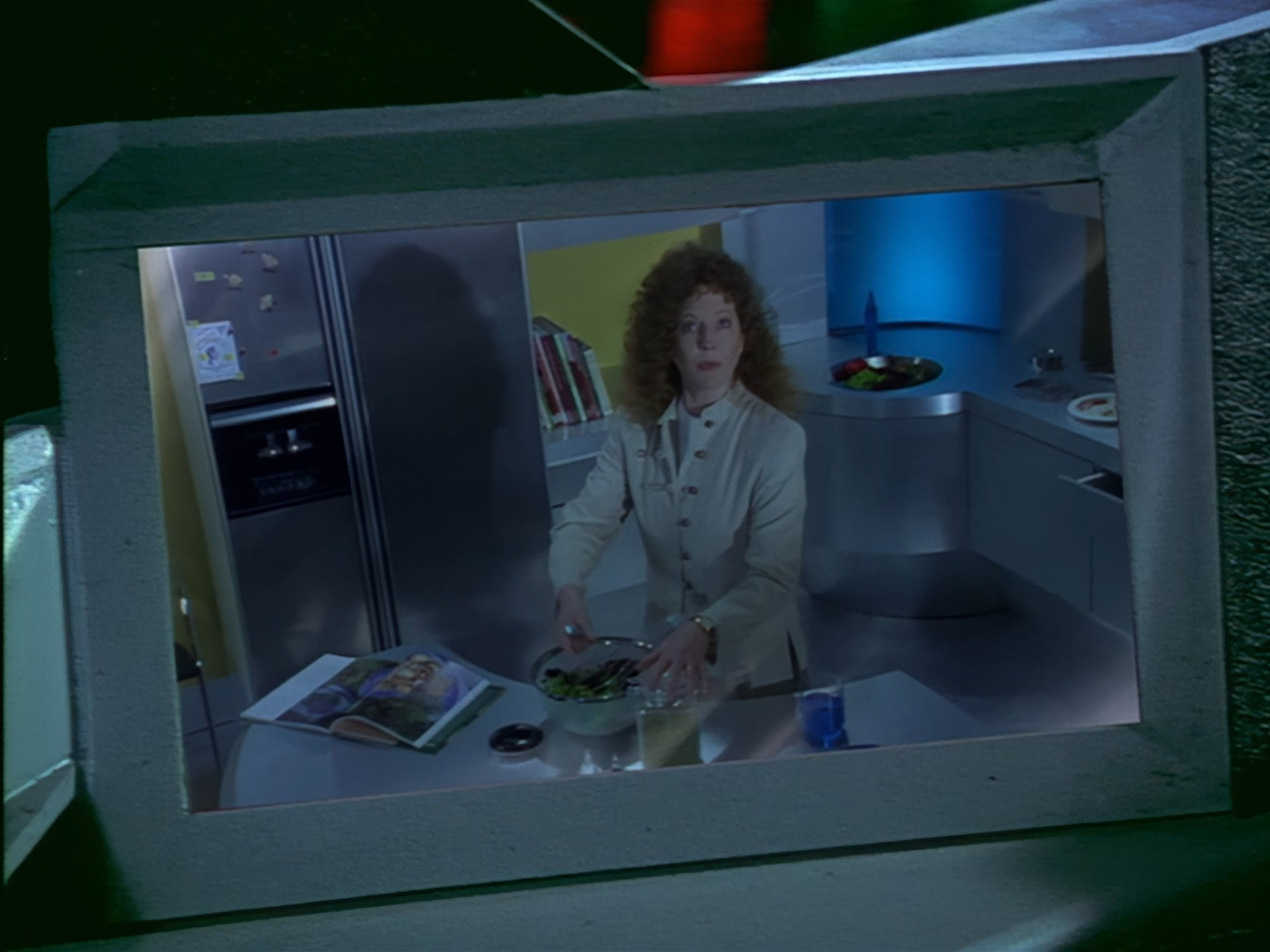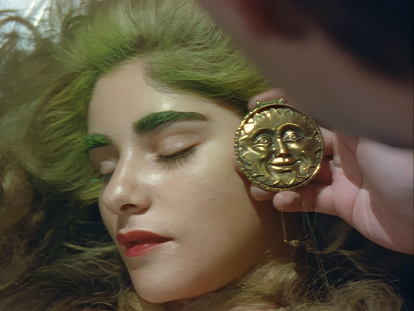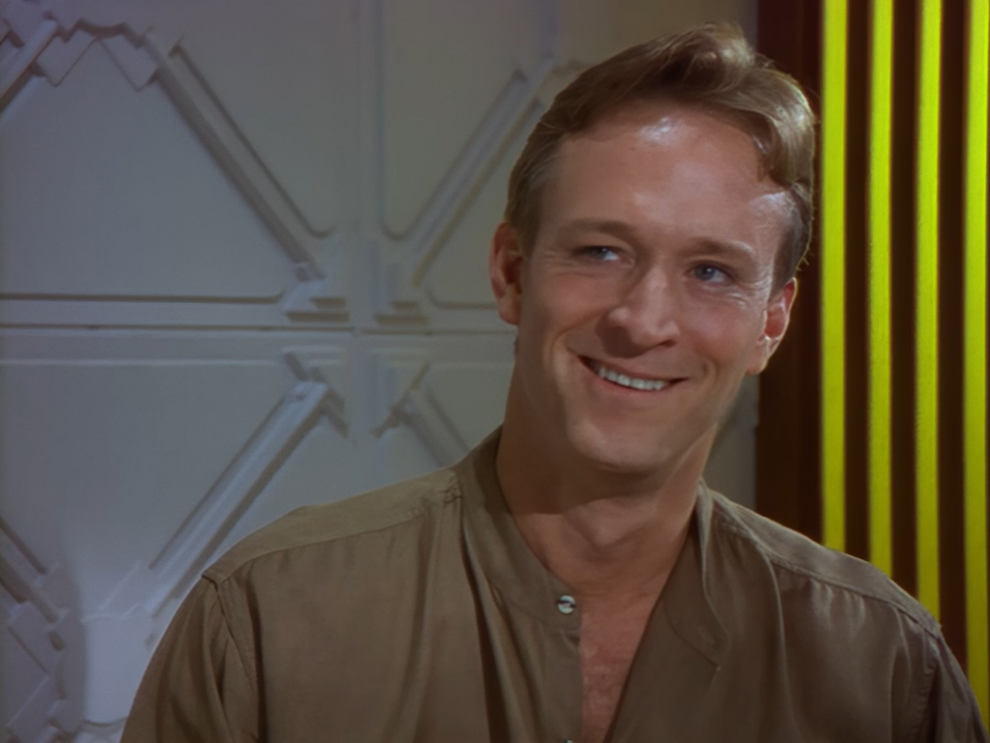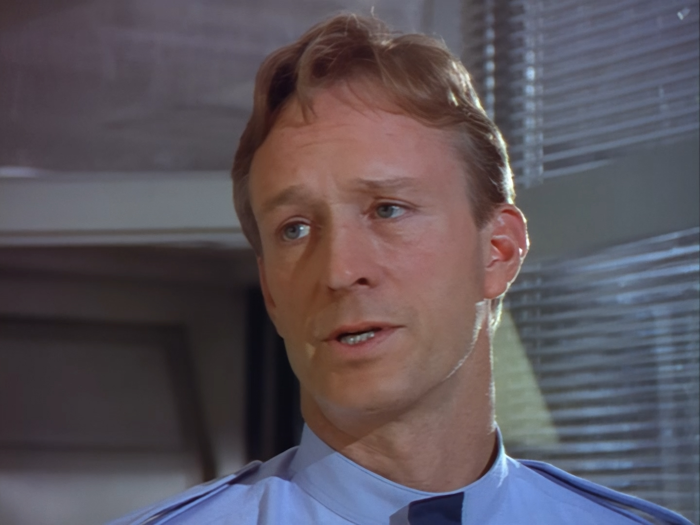 A green-haired lady appears from a doorway next to the sort of shelving unit you’d find in the back of a charity shop. Sadly, this is the point when viewers at home probably cringed so hard that the TV remote got sucked up into their hand and turned the show off. Not only is actor (and poet) Lana Citron dubbed really, really badly all the way through by Moir Leslie, but the writers actually dared to give Nissim the line, “Not to worry doll. You just concentrate on what you do best… being beautiful.” Oh but don’t worry, Nickolas Grace owns it completely by touching his girlfriend’s face like he’s stroking a fluffy duvet. I’m sure that won’t make anyone at home wretch.