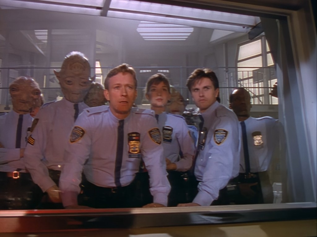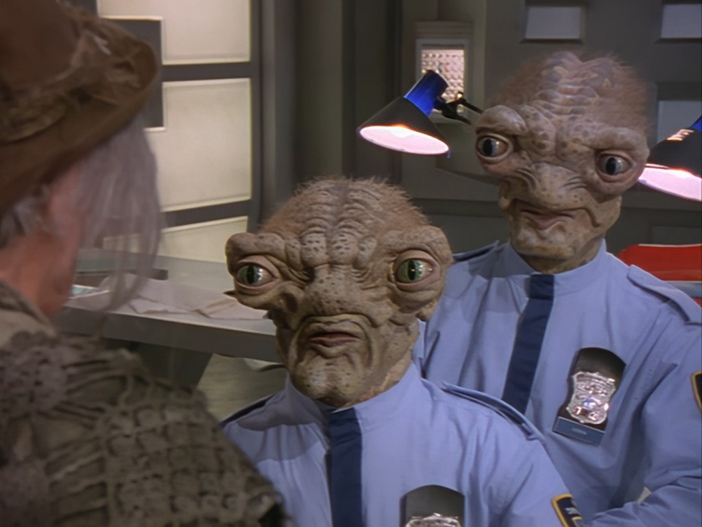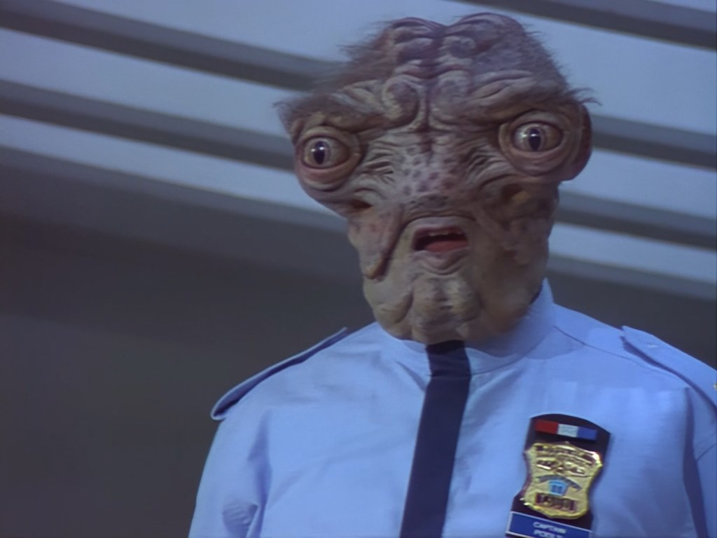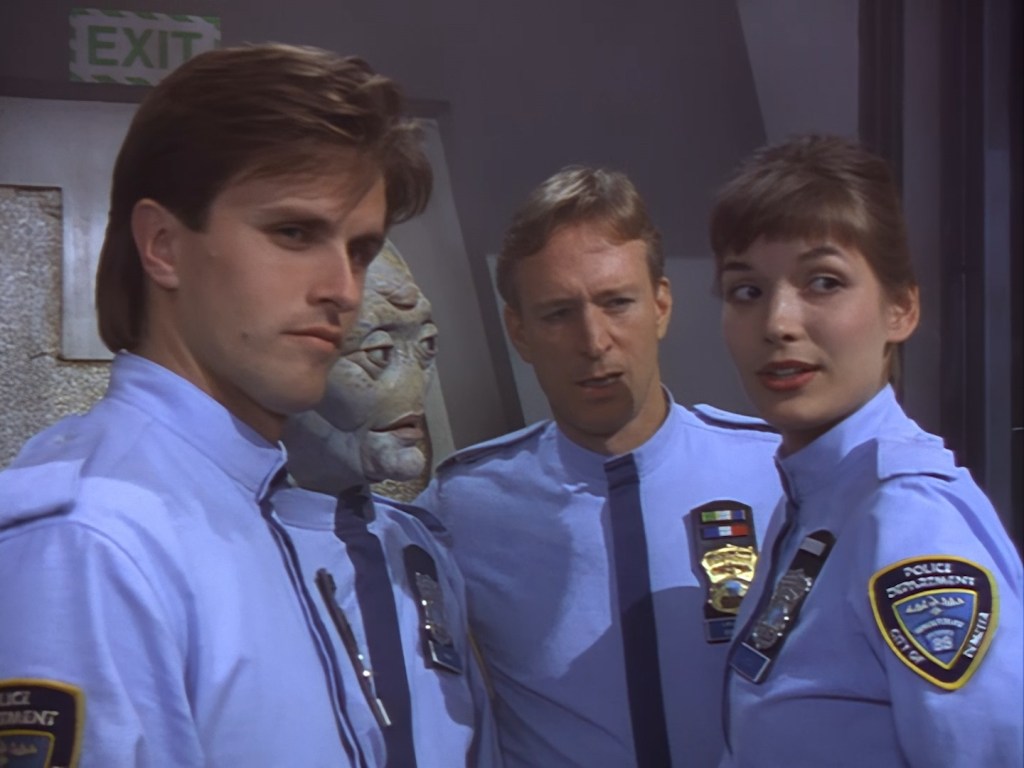 Look, maybe subtlety and genuinely intriguing crime mysteries are too much to ask for in a show like Space Precinct. Double Duty‘s writers, J. Larry Carroll and David Bennett Carren, wrote predominantly for science fiction shows and cartoons before working on the series. None of the writers had a pedigree for crime fiction. Therefore, the police procedural and mystery elements of Space Precinct were always destined to be rather ordinary… so why did they bother making them an intrinsic part of the show’s format?