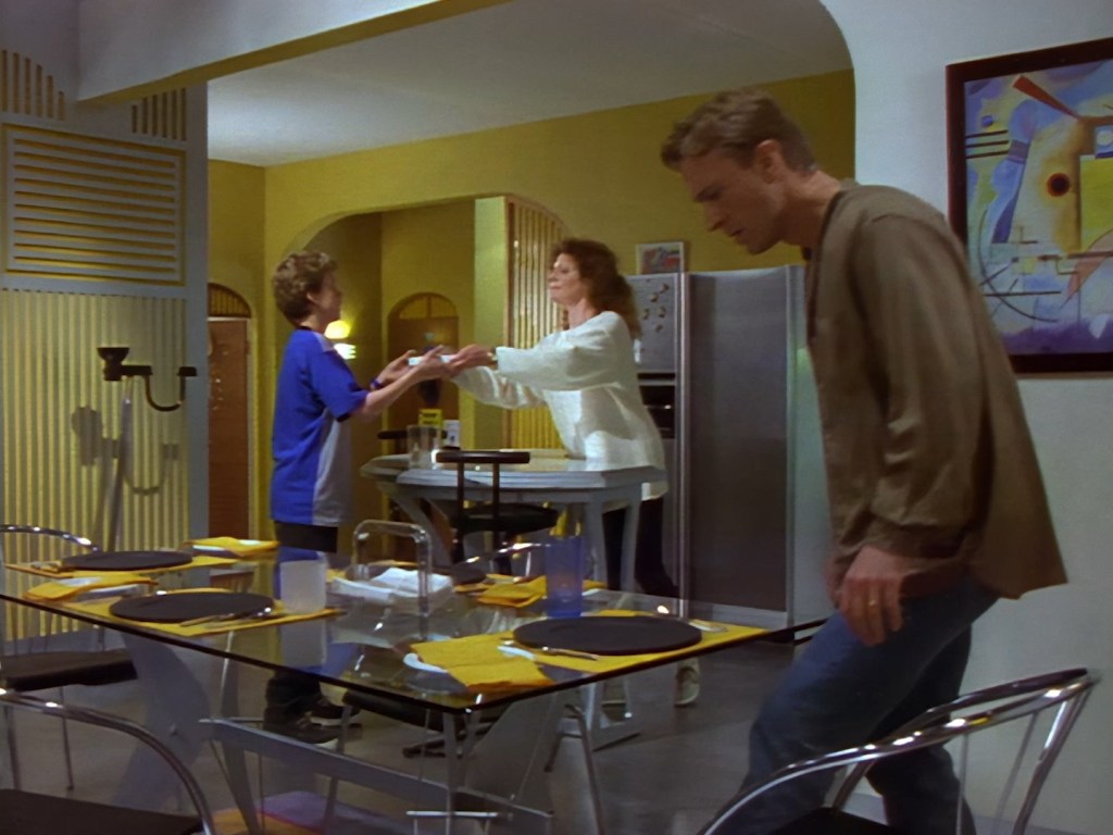 Meanwhile, Ted Shackelford and Rob Youngblood seem to be genuinely loving every second of playing cops and robbers and stomp through Nissim’s apartment with their guns out happily dragging as much tension out of the scene as possible. Suddenly it all feels like a proper crime series – not necessarily a family series – but maybe a straight up drama that the parents can enjoy once the kids are in bed.