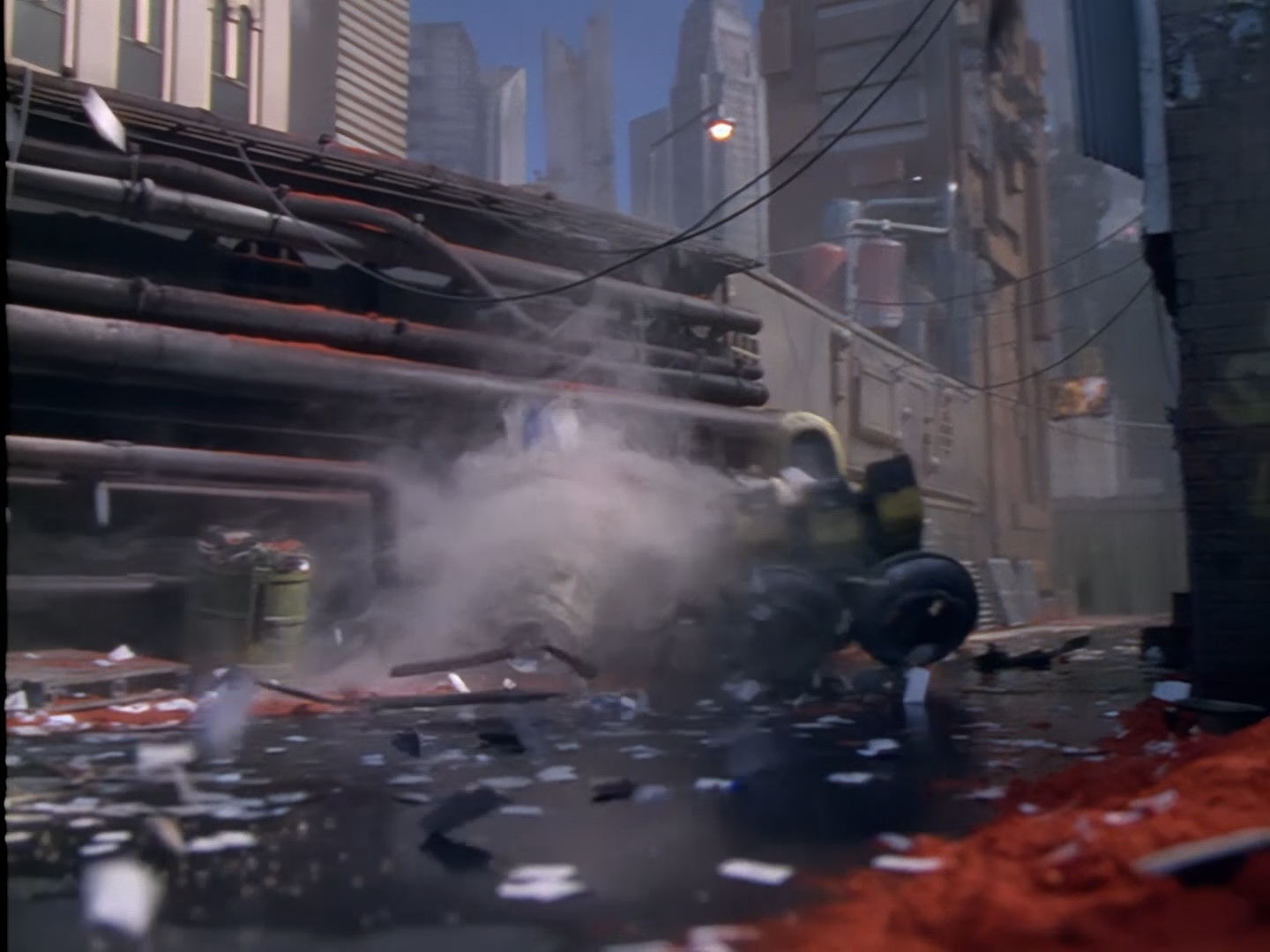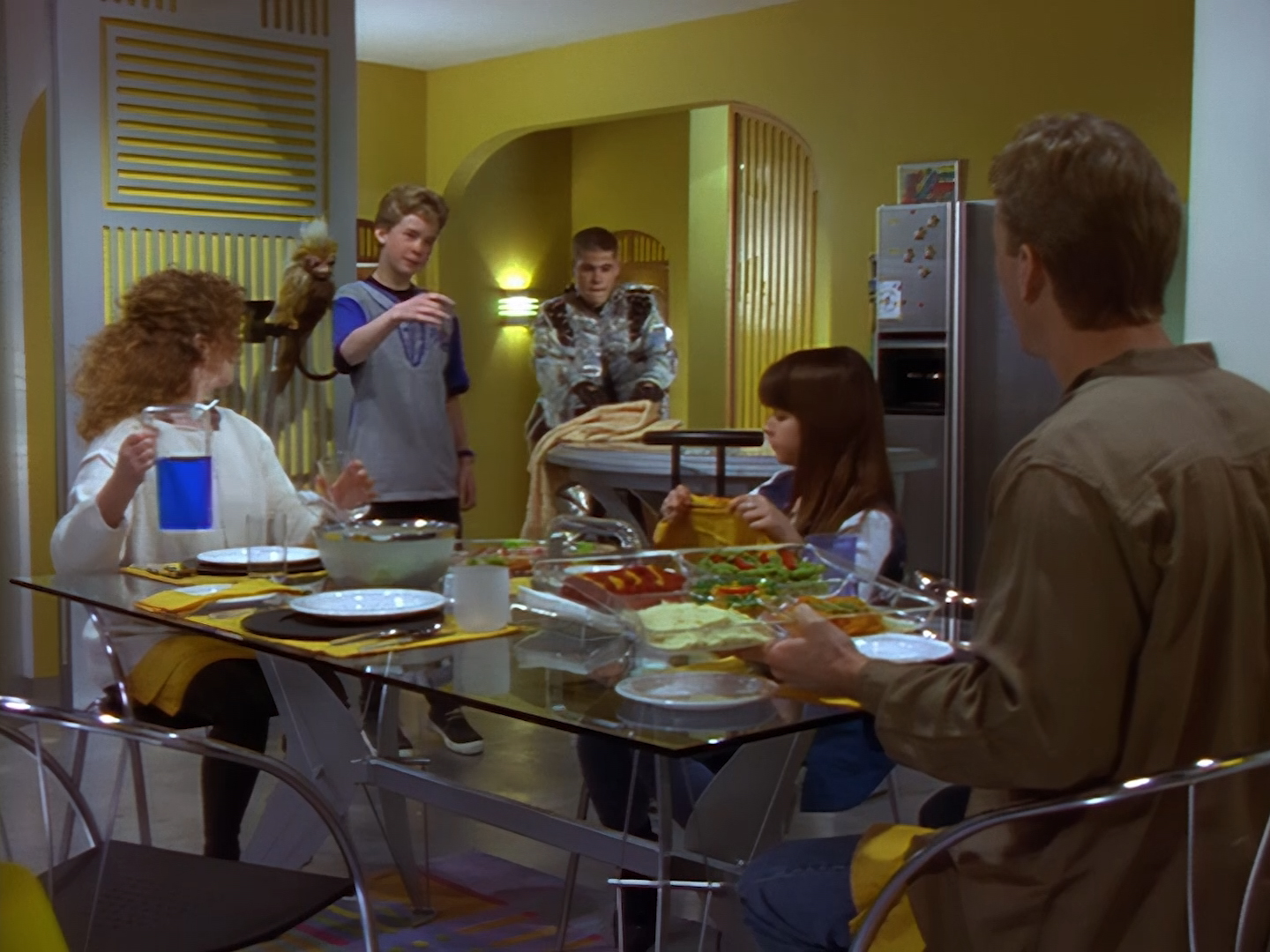 From clichés to the completely unexpected – here’s a badly dubbed Idris Elba delivering a space pizza. Obviously some of the ridiculousness of this whole bit is purely a result of retrospective. Nobody in 1994 could have predicted that Idris Elba would turn out to be an insanely talented, insanely recognisable, insanely respected actor… especially off the back of this appearance in Space Precinct. But from David Healy’s terrible dubbing, to the space helmet that just doesn’t fit on Idris Elba’s head, to the mere prospect of a pizza delivery boy turning up looking and sounding that handsome, everything about this is cockabonkers. And while there’s an extent to which it’s supposed to look highly suspicious for the benefit of the plot, I just have to throw up my hands and wonder what on earth they were all thinking.