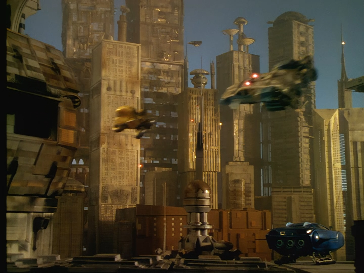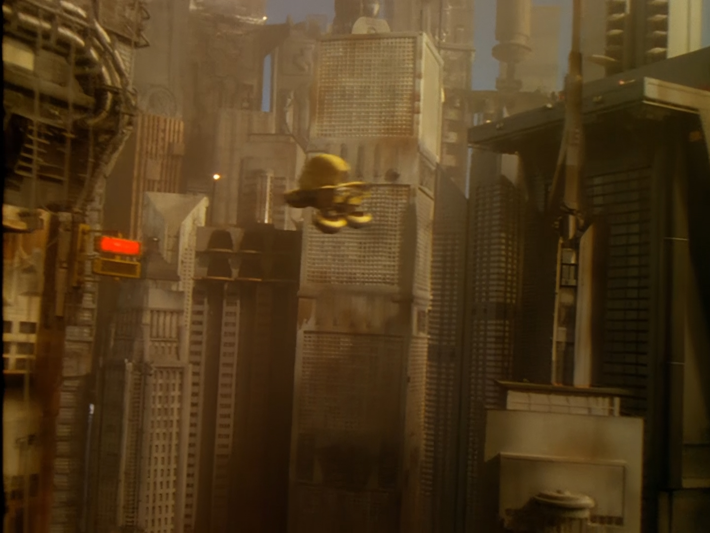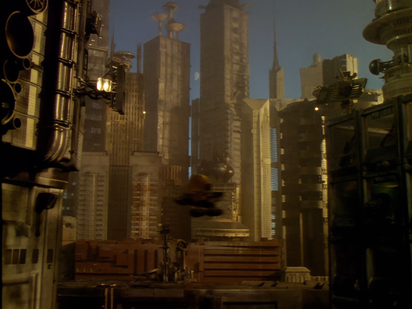 Never mind all that ugliness for a moment because here is an absolutely gorgeous shot of Precinct 88 in all her glory! After the police cruisers, this orbiting space station is probably the most recognisable model from the whole show designed by Steve Begg and built by Bill Pearson, Steve Howarth and the model team. This effects shot, like many others seen in Space Precinct is a composition of several layers of film, video, and digital effects which seem to have polished up beautifully for this HD release. The sky above Altor is rarely portrayed as just being black with twinkly bits – they really make an effort.