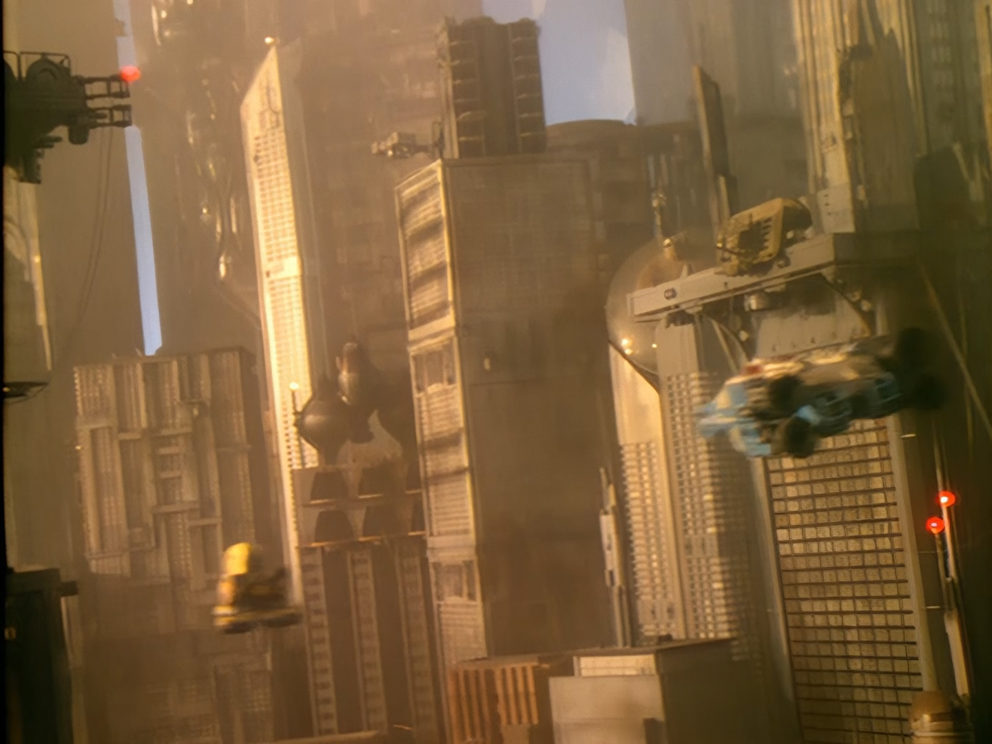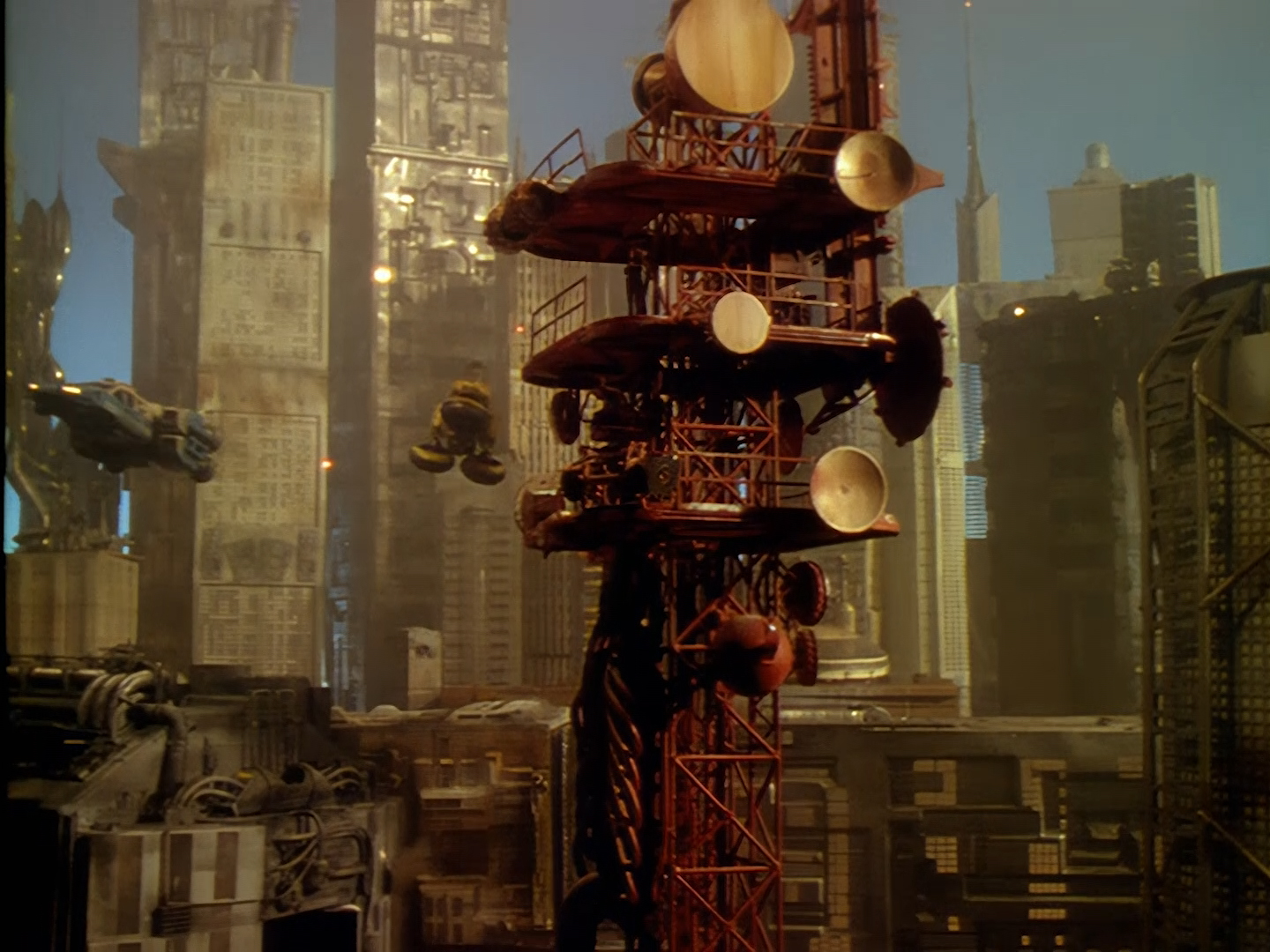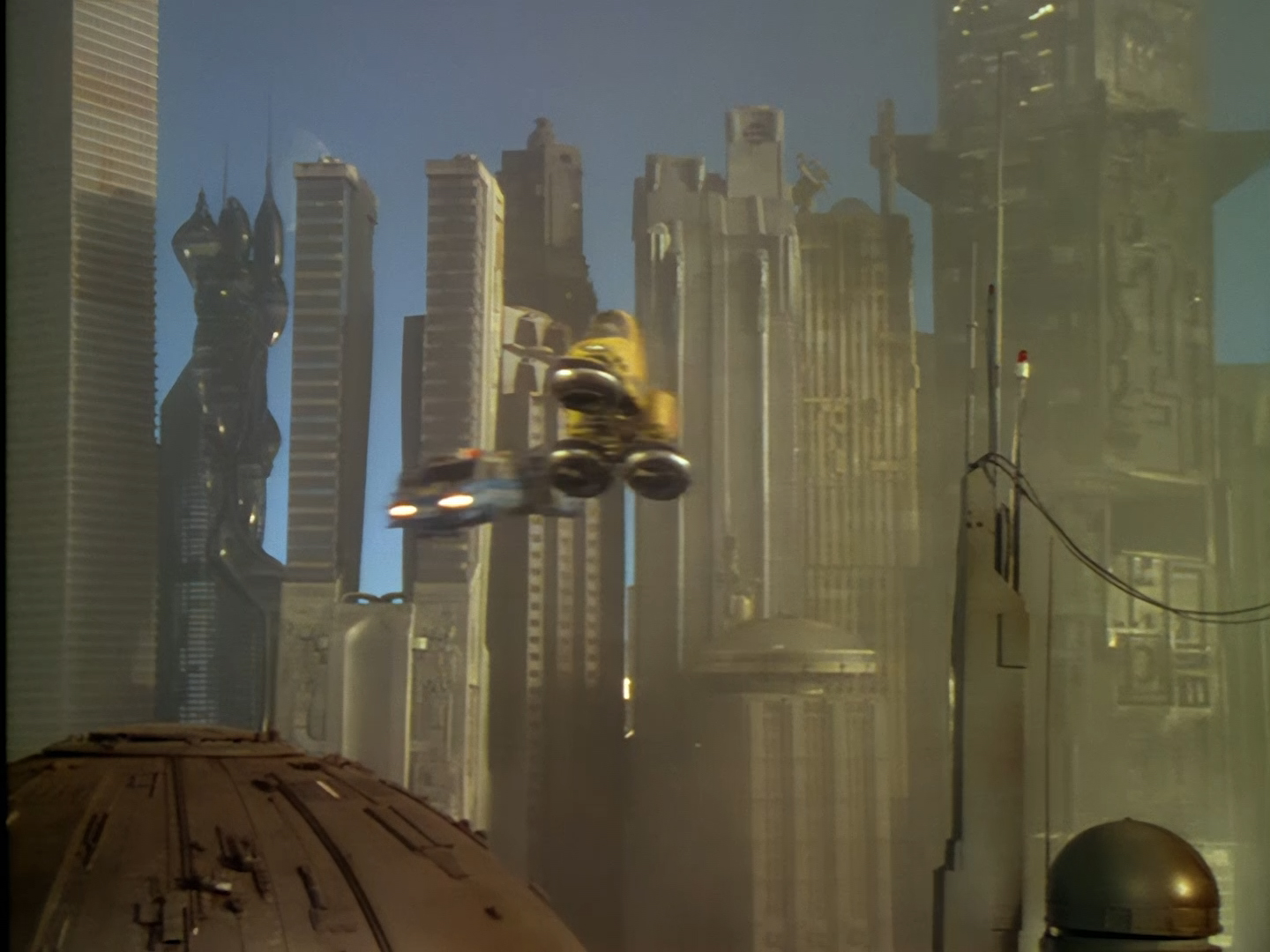 Never mind all that ugliness for a moment because here is an absolutely gorgeous shot of Precinct 88 in all her glory! After the police cruisers, this orbiting space station is probably the most recognisable model from the whole show designed by Steve Begg and built by Bill Pearson, Steve Howarth and the model team. This effects shot, like many others seen in Space Precinct is a composition of several layers of film, video, and digital effects which seem to have polished up beautifully for this HD release. The sky above Altor is rarely portrayed as just being black with twinkly bits – they really make an effort.