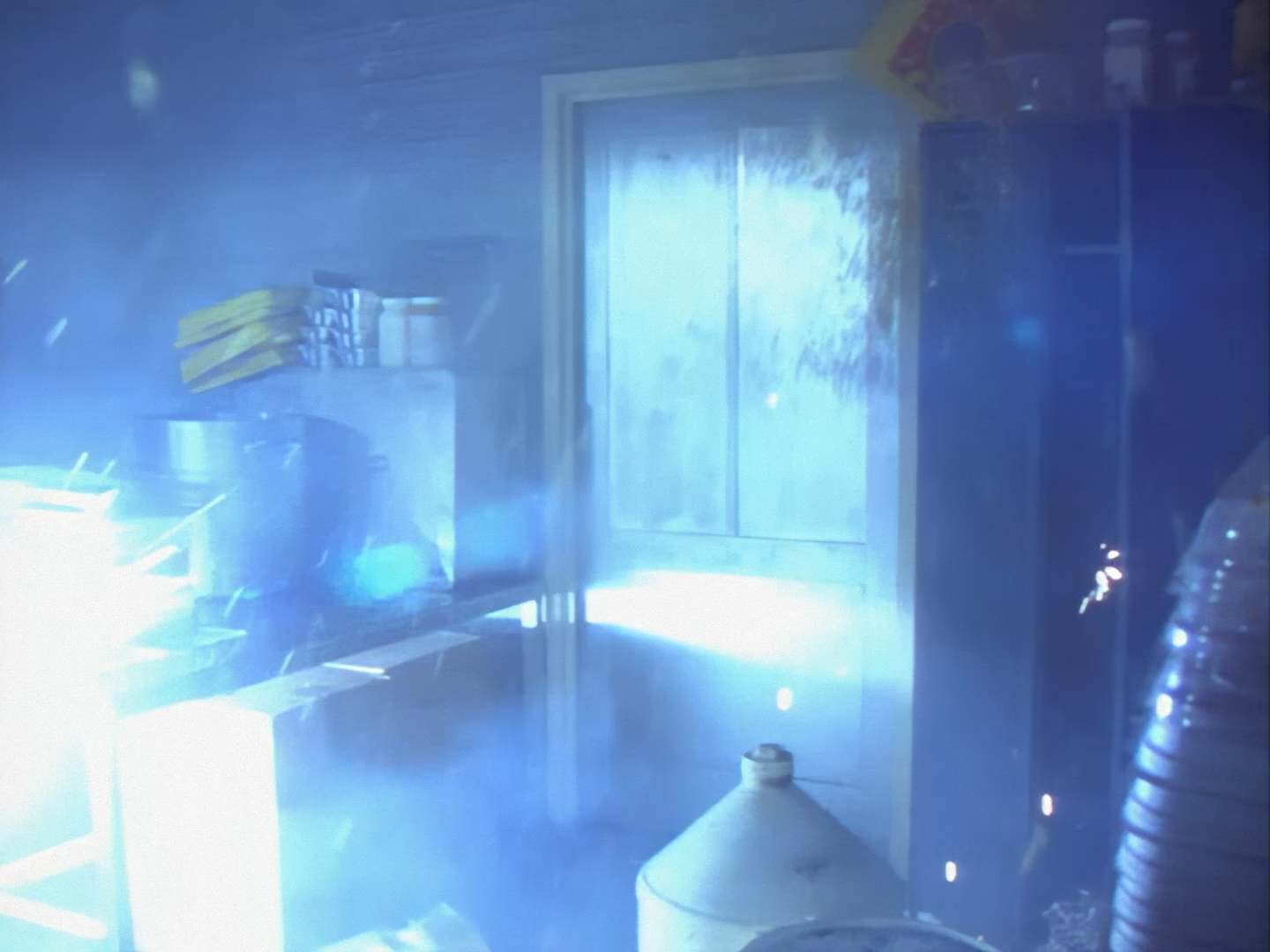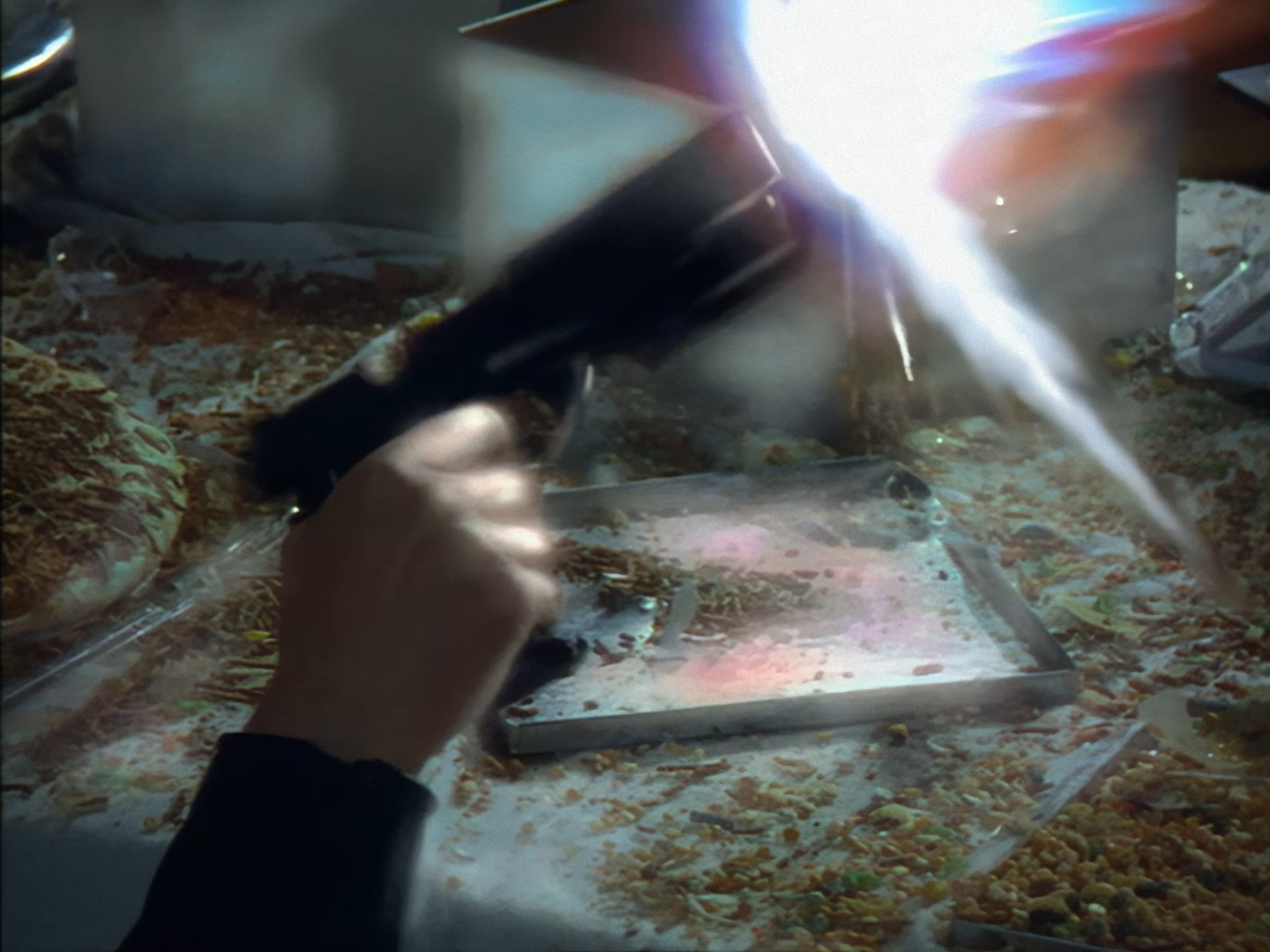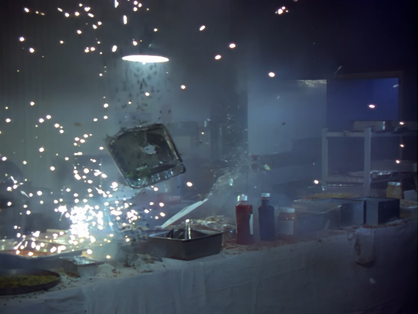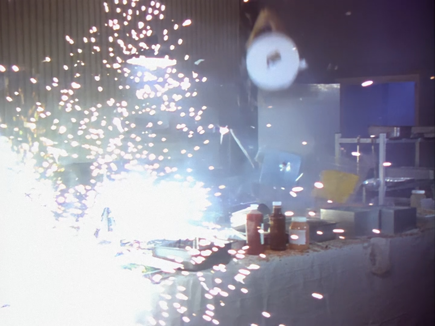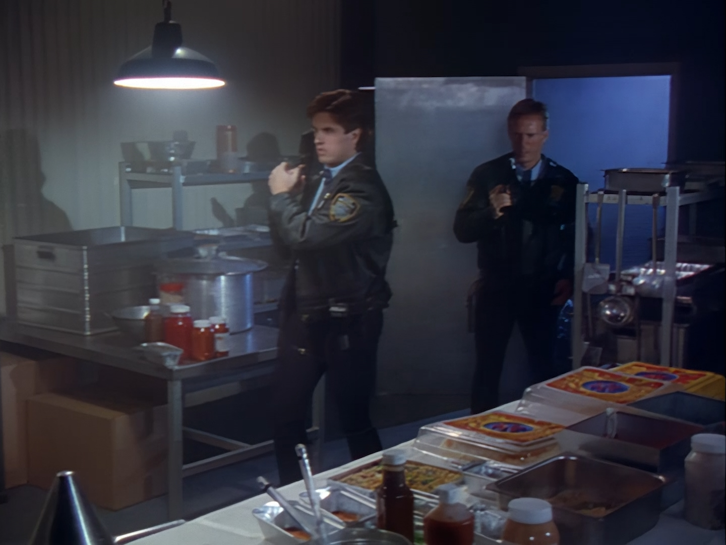 Wow! Suddenly, the pizzeria erupts into a spectacular shootout. They really go for it. Huge bangs, characters ducking and diving, ingredients thrown everywhere. The digital effects for the gunfire look amazing, especially considering you’re not supposed to slow the sequence right down and take screengrabs like I have. The story goes that poor Ted Shackelford was actually injured during filming when a stray sliver of wood was accidentally blasted into his cheek, resulting in further scheduling issues for the over-stretched production while he was being treated – although we’ll address an alternative version of that anecdote in next week’s episode.
