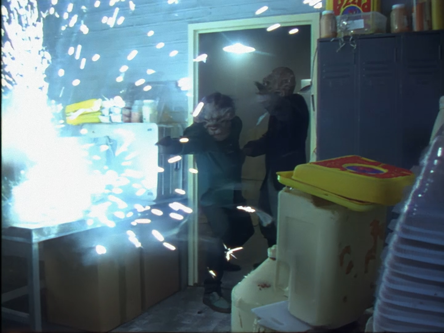 On-screen, Brogan and Haldane are back on their feet in no time at all and pursue the villains through the pizzeria, only to be stopped by the sounds of extreme violence. Ted and Rob are once again having the time of their lives running around with guns and playing the drama of the scene to the fullest.