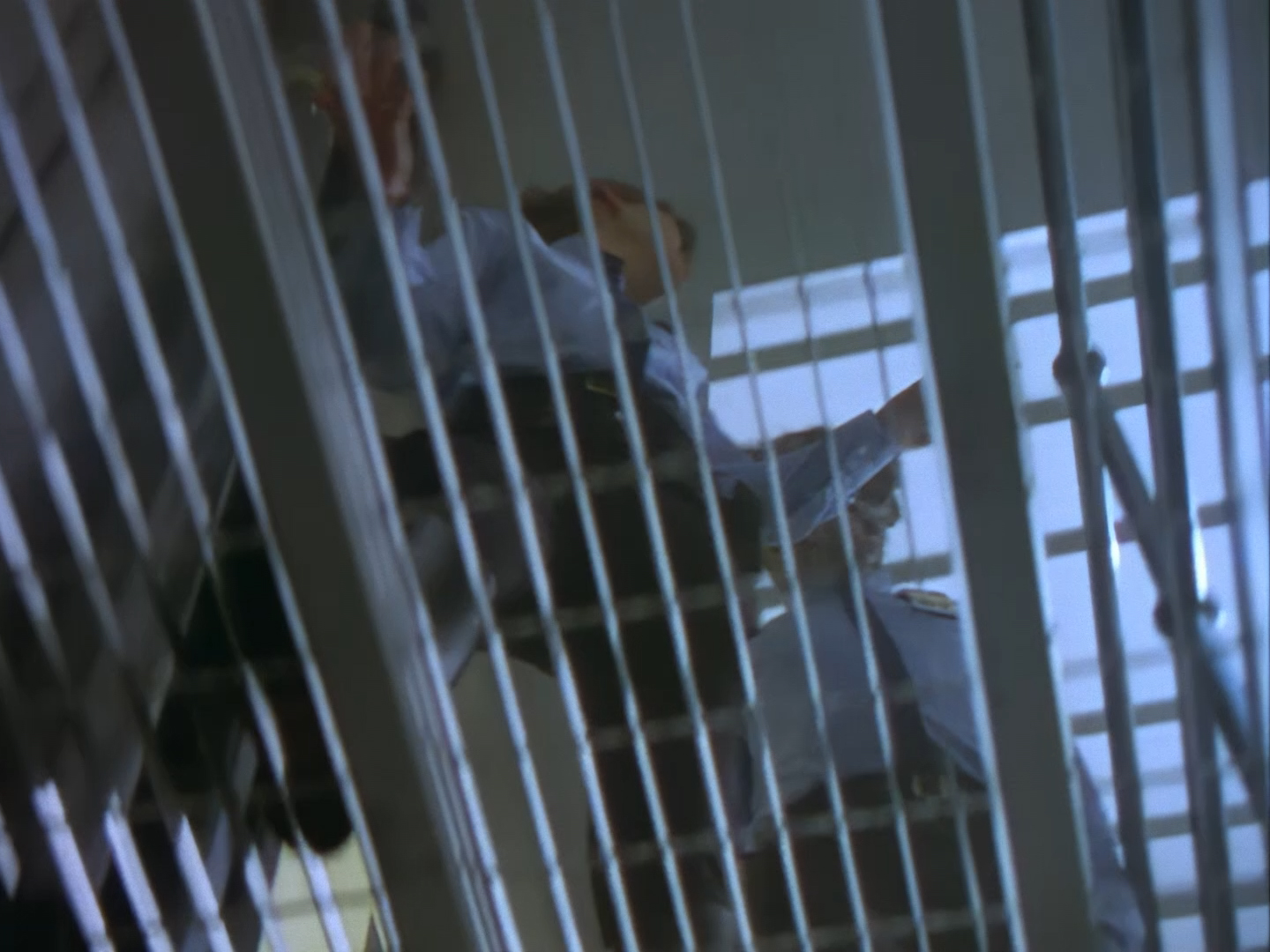 Bit of dodgy continuity here. Earlier, Haldane and Took left the impossibly tiny interrogation room, telling Aleesha to stay where she was, and then entered the main station house set on the ground floor. So, why is Haldane now bringing Aleesha down those tricky spiral stairs? Okay, okay, they might have taken her somewhere else in the meantime, but I wouldn’t be doing my job if I didn’t at least mention it.