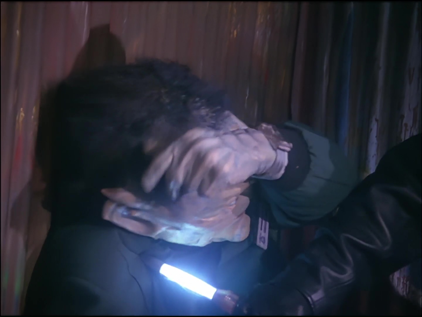 Reflecting the mood of the audience at home, Fredo’s daughter is falling asleep. Her name is Estes, and it’s past her bedtime. The cute bows in her hair might be a bit much, but otherwise I think the character design for Estes is very well done. Translating the key features of the Tarn design into a more youthful face must have been tricky, but it definitely works. But did the Space Precinct producers really condemn a child actor to spend their days sweating in a rubber mask? Surprisingly not! After all, filming with children is time-consuming and not exactly cost-effective. Nope, playing the little girl is a 38-year-old man by the name of Kiran Shah. Standing at 4’2″, Shah is an actor, stand-in, and stunt performer who regularly doubles for children, small alien characters, and a number of hobbits in The Lord of the Rings and The Hobbit series. Needless to say, the Space Precinct producers put him to work in a number of other episodes after this one because Kiran Shah is very good at what he does. Until I looked up the cast list, I was convinced Estes was being played by a child actor in the mask. Of course, the voice is someone else – a rare case of Space Precinct re-voicing actually feeling justified.