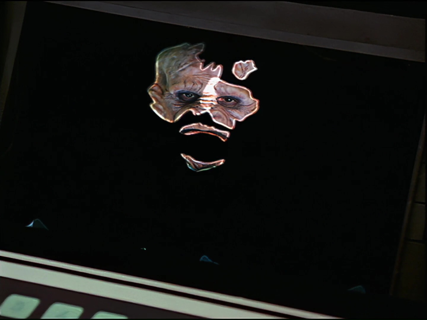 Here’s a very clear demonstration of just how little visibility an actor in a Tarn mask would actually have on the set. Underneath Estes’ eyes you can spot two slits where gauze is visible that would allow Kiran Shah to see out. Usually the gauze is much less obvious, but the way this shot is lit makes the peep holes show up more than normal.